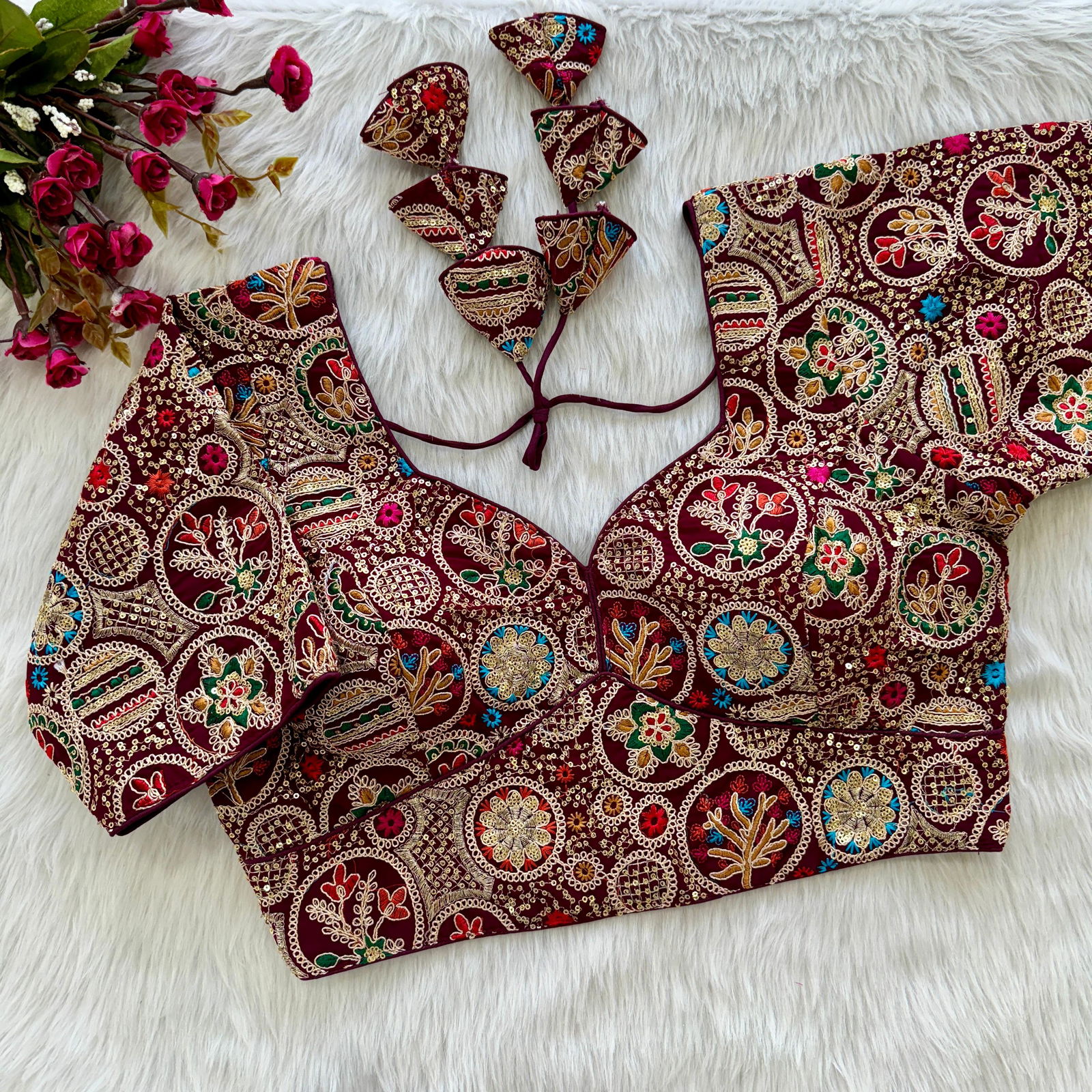 Elevate your party look with our intricately stitched, heavily padded blouse. Handmade hooks, back-open style, and beautiful latkans add allure. A perfect blend of elegance and sophistication for any occasion.