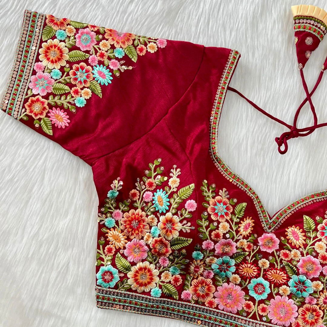 Celebrate Navratri in style with our "Navratri Special Nidal Multi Work Blouse." Crafted from Heavy Timo Silk, it boasts intricate Heavy 11 Nidal Wishkosh Multi Thread work complemented by vibrant Rainbow Sequences, ensuring a festive look that captivates.