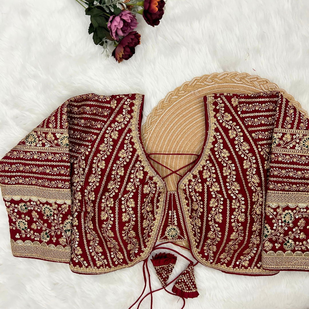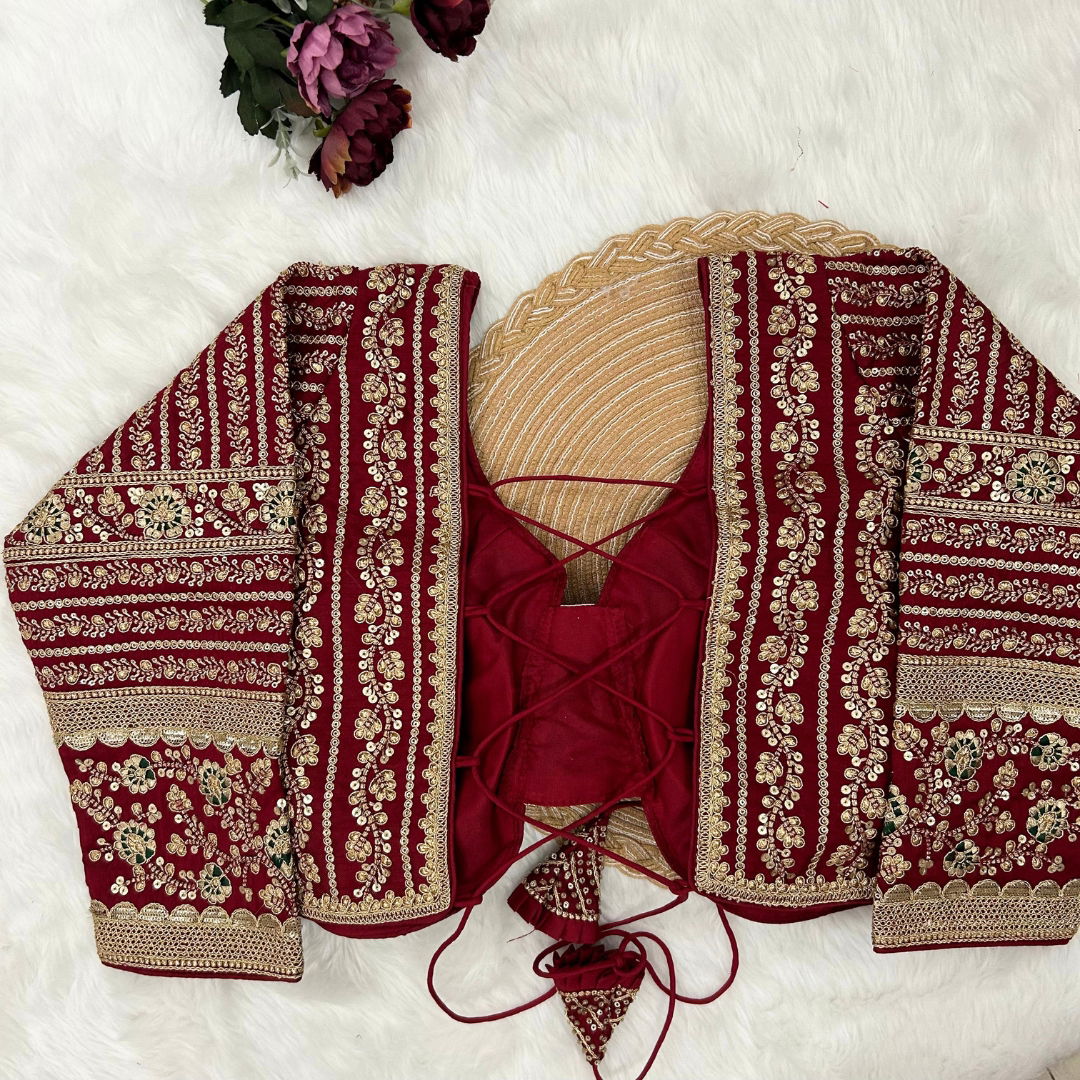 Make a statement in this beautiful bridal look blouse featuring a backless design with stylish dori. Crafted from rich Timo Silk, it comes with extra-long18-inch sleeves and soft padding for comfort. Perfect for weddings or special occasions, this designer blouse is ready in size 40 and alterable up to 44.