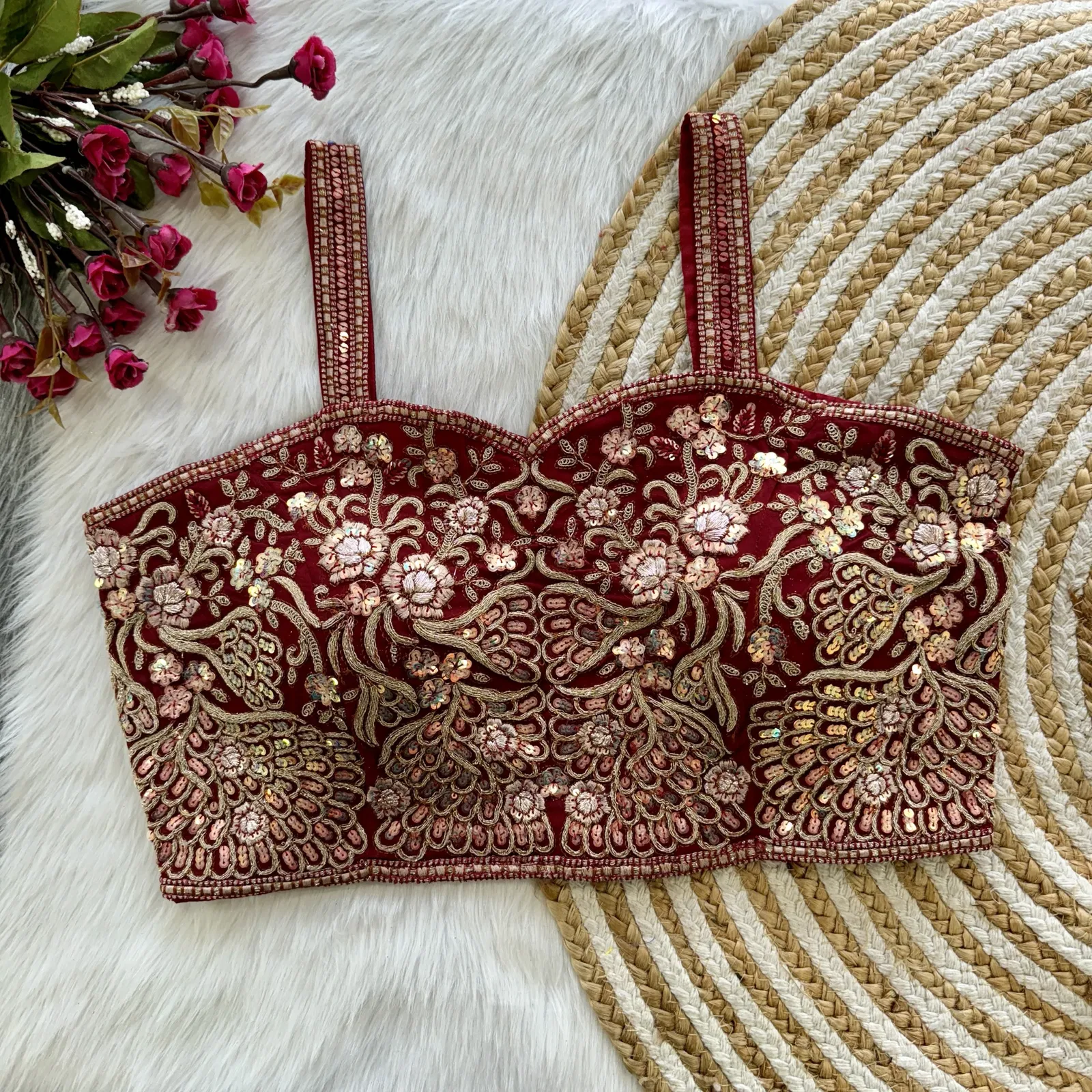 Indulge in opulence with this stunning blouse, featuring heavy embroidery and beautiful handwork. Crafted from heavy fox georgette, it exudes elegance and grace. The blouse comes in a size 38” ready to be altered up to 42 inches, offering a perfect fit. With its back open style and spaghetti straps, it's perfect for a party or special occasion.
