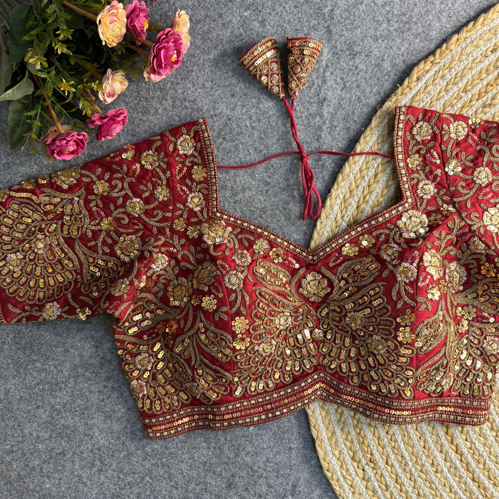 Grace your bridal look with this designer blouse crafted from heavy pure soft Italian silk. Featuring elegant codding embroidery and sequin work, it’s heavily padded with fine stitching. The back-open style with handmade hooks and latkans adds charm, making it perfect for weddings and grand celebrations.