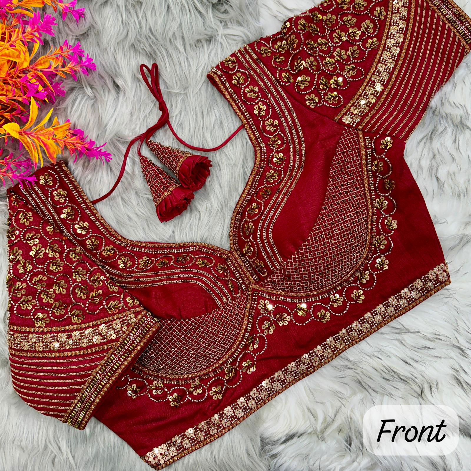 Sabyasachi Handwork Italian Silk Bridal Blouse — A luxurious bridal blouse crafted from premium Italian silk, adorned with exquisite Sabyasachi-style hand embroidery. Designed for timeless elegance on your special day. Length 15 inches, size alterable from 34 to 44 inches. Perfect for pairing with bridal sarees and lehengas for a royal, graceful look.