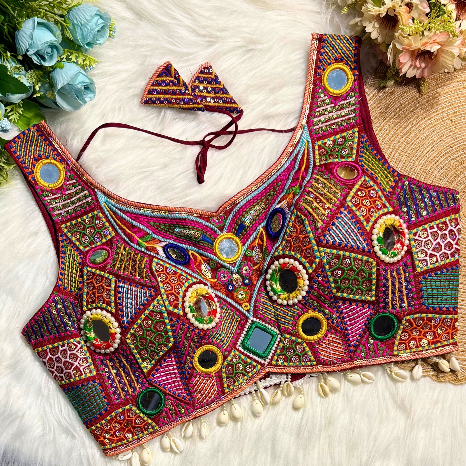 Get ready for Navratri, Garba, and Dandiya nights with this stylish readymade blouse. Made from rich Heavy Italian Silk, it features a fancy Gamthi and Shell Lace design. The blouse is padded, stitched beautifully, and perfect for festive nights. A must-have readymade blouse for your ethnic celebration look.