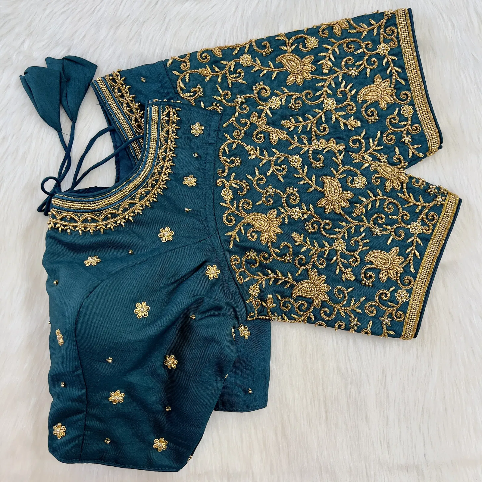 Morepeach Pure Silk Zardosi Handwork Blouse — Elegant blouse crafted in pure silk with intricate zardosi hand embroidery. Comes with a length of 15 inches and an alterable size from 34 to 44 inches. Perfect pick for weddings, parties, and festive wear.