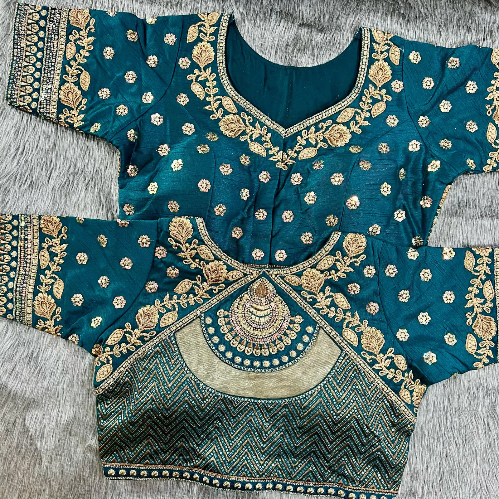 Introducing our exquisite "Heavy Wedding Blouse" crafted for the discerning bride seeking timeless elegance. This opulent blouse features intricate GOLD Jari with Rainbow 4 Sequence Heavy Embroidery Work, creating a dazzling masterpiece. The luxurious fabric, Heavy TIMO Silk, ensures a regal feel. Available in Plus Size 40” (alterable up to 42 inches), this blouse boasts a Beautiful Gold Work bridal design, meticulously stitched with Heavy Padded Handmade Hooks and adorned with Beautiful Latkans. The Front open Style adds a touch of modern sophistication. Elevate your bridal ensemble with this statement piece, a perfect blend of tradition and contemporary style.