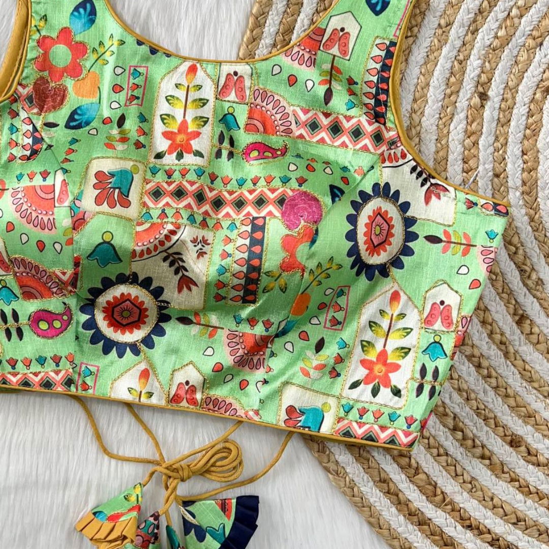 Indulge in the perfect blend of tradition and trend with our latest blouse arrival. Crafted from sumptuous Phantom Silk, the blouse boasts a gorgeous floral position digital print, accentuated with intricate Aari work. The superb multicolor prints effortlessly complement any saree or lehenga, making it a versatile choice for all occasions. The back open hooks add a modern flair, ensuring you stand out in style.