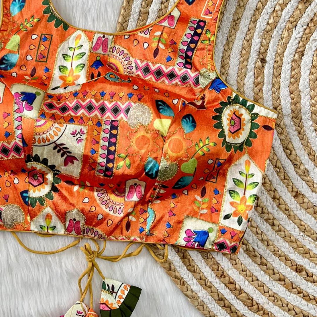 Indulge in the perfect blend of tradition and trend with our latest blouse arrival. Crafted from sumptuous Phantom Silk, the blouse boasts a gorgeous floral position digital print, accentuated with intricate Aari work. The superb multicolor prints effortlessly complement any saree or lehenga, making it a versatile choice for all occasions. The back open hooks add a modern flair, ensuring you stand out in style.