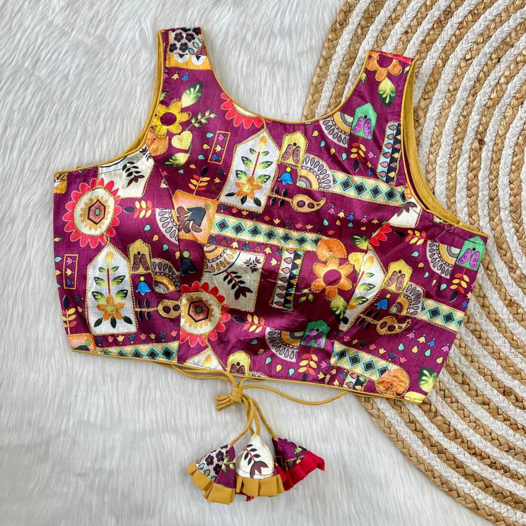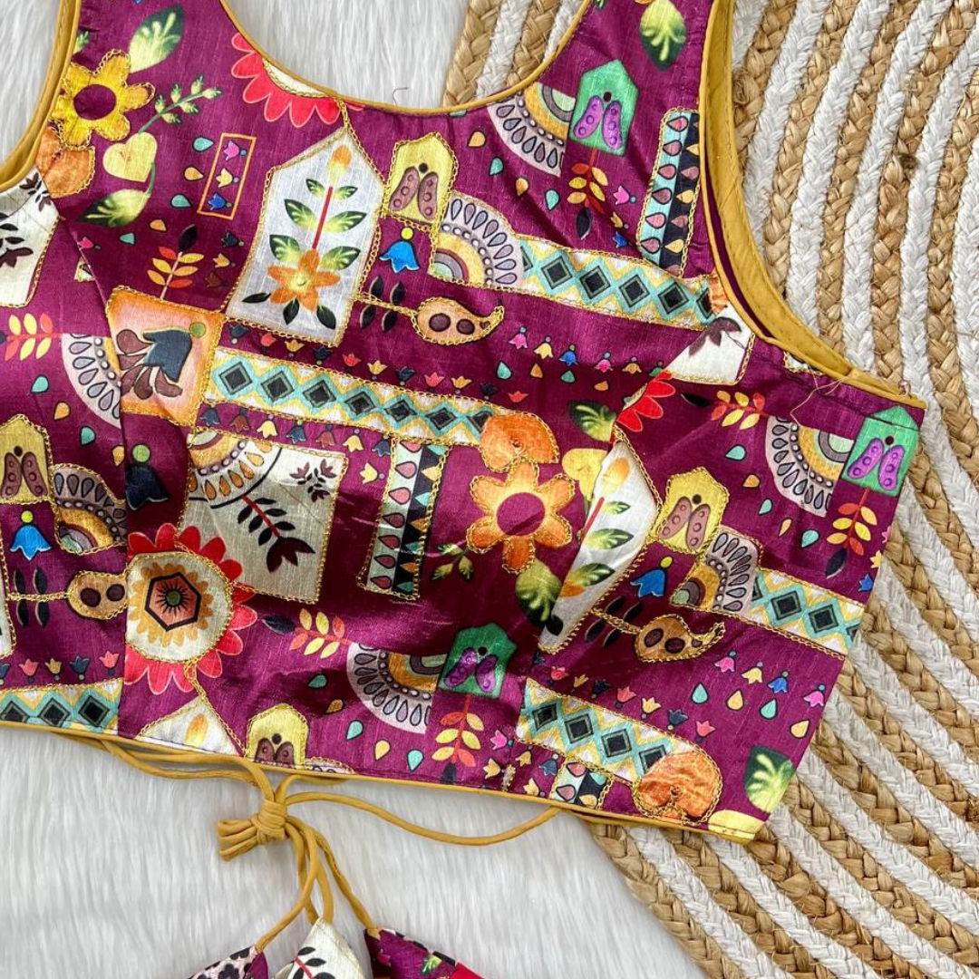 Indulge in the perfect blend of tradition and trend with our latest blouse arrival. Crafted from sumptuous Phantom Silk, the blouse boasts a gorgeous floral position digital print, accentuated with intricate Aari work. The superb multicolor prints effortlessly complement any saree or lehenga, making it a versatile choice for all occasions. The back open hooks add a modern flair, ensuring you stand out in style.