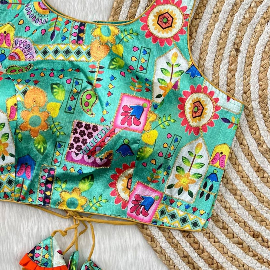 Indulge in the perfect blend of tradition and trend with our latest blouse arrival. Crafted from sumptuous Phantom Silk, the blouse boasts a gorgeous floral position digital print, accentuated with intricate Aari work. The superb multicolor prints effortlessly complement any saree or lehenga, making it a versatile choice for all occasions. The back open hooks add a modern flair, ensuring you stand out in style.