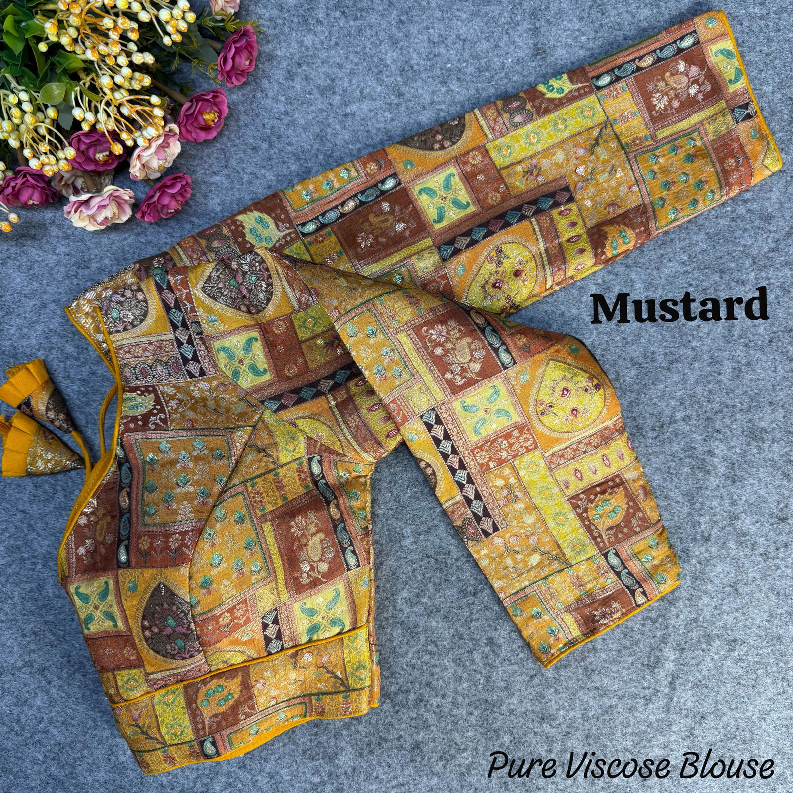 Embrace vintage elegance with this stunning long-sleeve blouse crafted from heavy pure viscose jacquard. Featuring exquisite position print work, heavy stitching, and padding for a structured fit, this blouse is designed to make a statement. The back-open style with delicate latkans adds charm. Available in 6 beautiful colors, ready in size 40, alterable up to 42 inches.