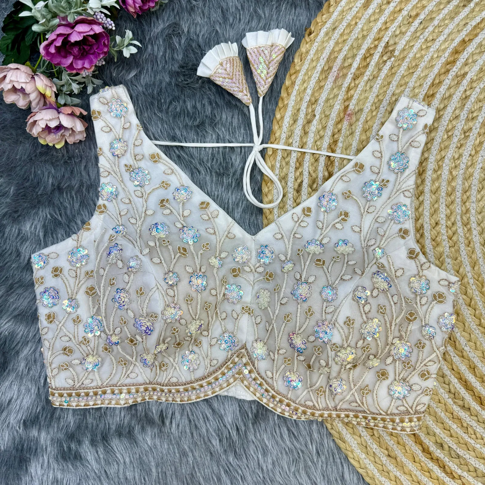 Elevate your party look with our exquisite Partywear Blouse, featuring heavy stitching, padding, and intricate embroidery. With a glamorous back-open style and stunning handwork, it's the epitome of elegance for any special occasion.Elegant bridal blouse featuring heavy long stitch apple-cut cording work with intricate detailing. Designed with heavy stitching, padding, handmade hooks, and beautiful latkans, in a stylish back-open style.
