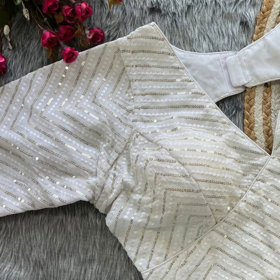 Step into style with this fancy partywear blouse made from premium heavy fox georgette. Featuring intricate sequence embroidery, soft padding, and elegant 12-inch sleeves, this blouse offers a perfect blend of comfort and glam. Designed with a back open style and handmade hooks, it's ideal for festive or wedding occasions.