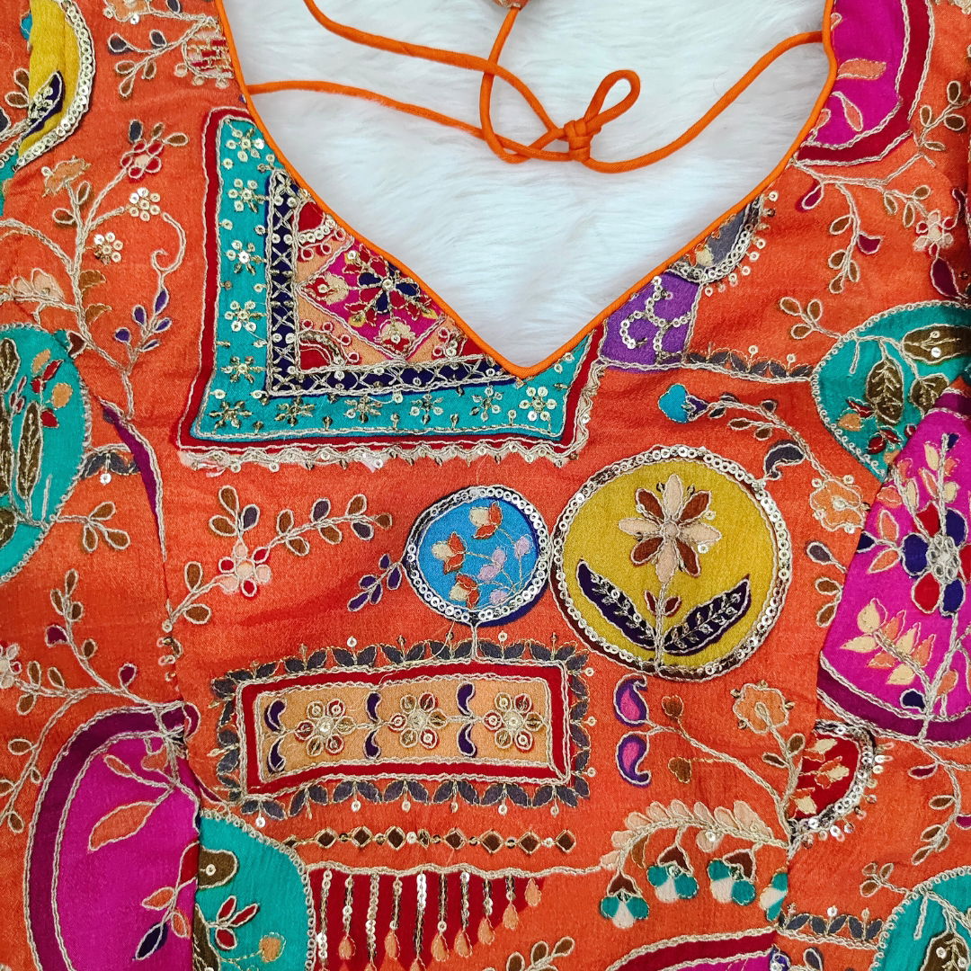 Elegant Chinon fabric blouse with digital print, perfect for Navratri. Lightweight, vibrant, and comfortable, ideal for festive celebrations. Stylish and unique for a standout look.