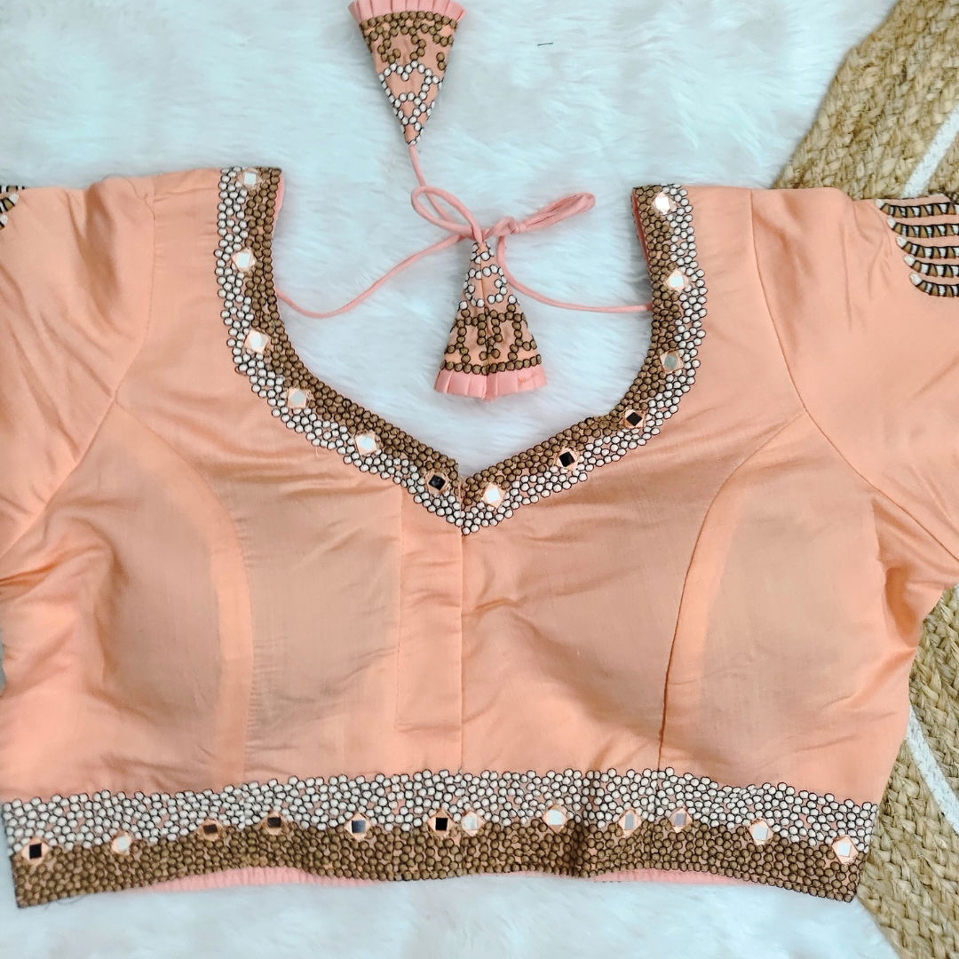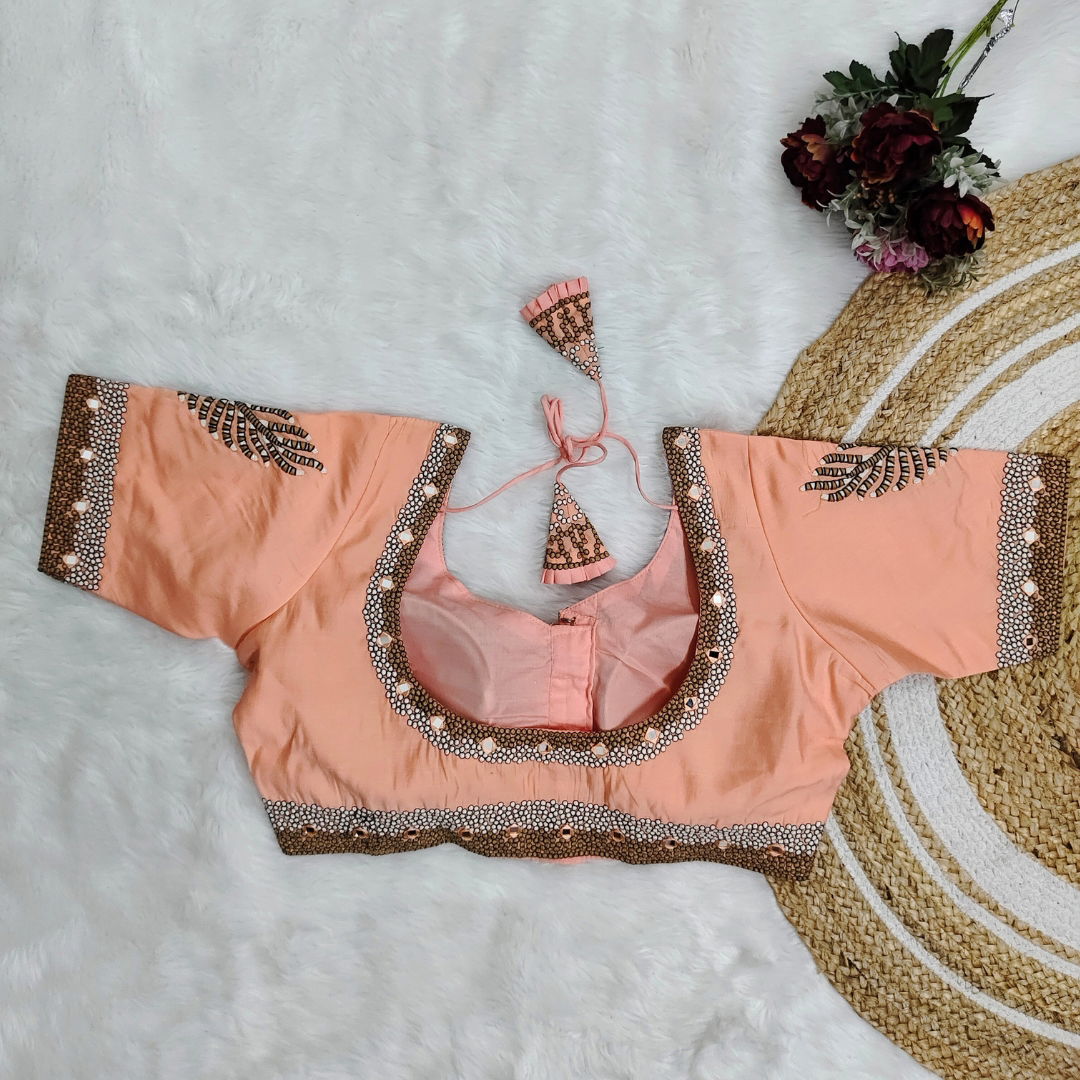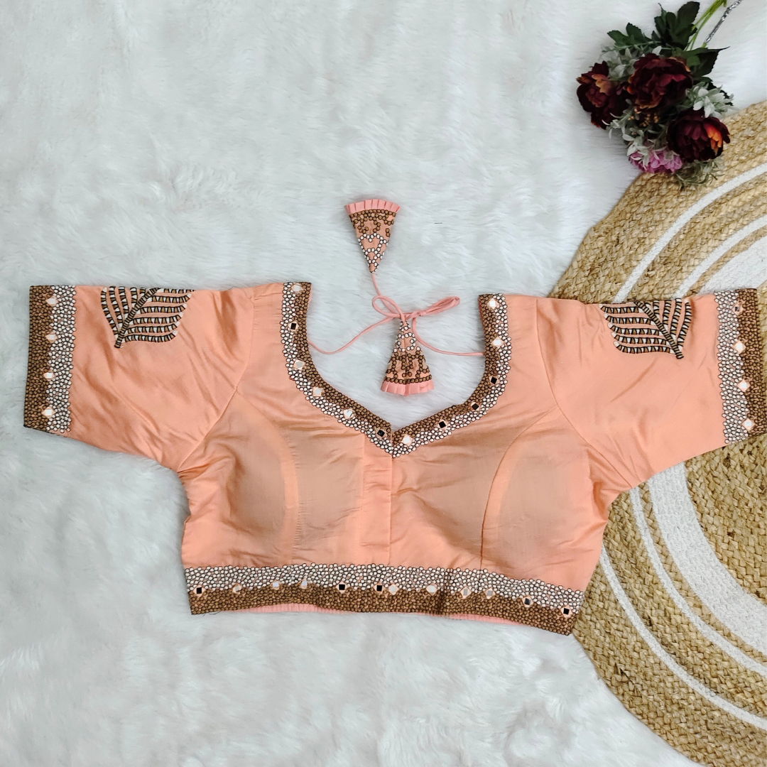Pure Timo Silk handmade designer blouse with heavy thread embroidery and intricate handwork. Features real mirror embellishments. Elegant, unique, and perfect for special occasions.