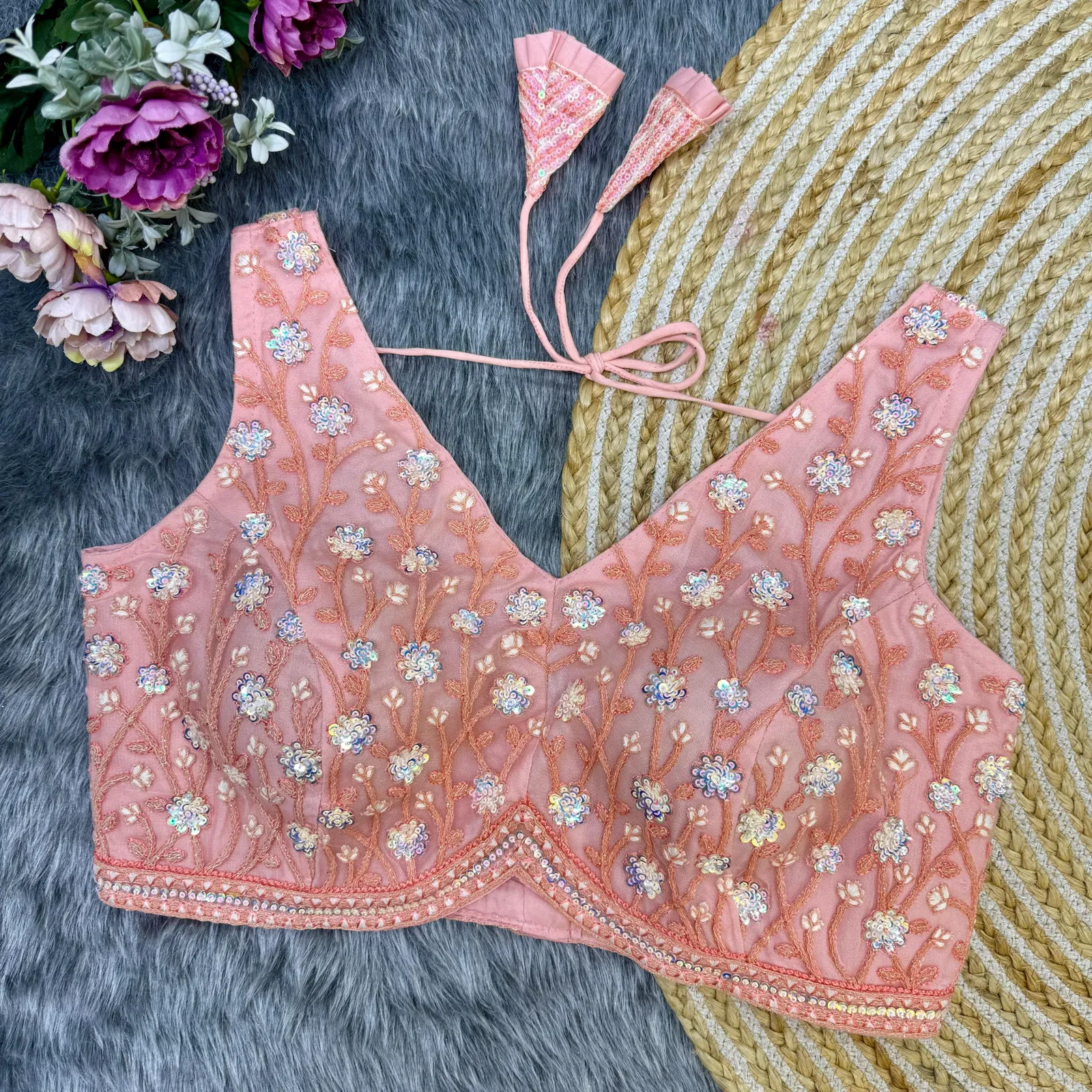 Elevate your party look with our exquisite Partywear Blouse, featuring heavy stitching, padding, and intricate embroidery. With a glamorous back-open style and stunning handwork, it's the epitome of elegance for any special occasion.Elegant bridal blouse featuring heavy long stitch apple-cut cording work with intricate detailing. Designed with heavy stitching, padding, handmade hooks, and beautiful latkans, in a stylish back-open style.