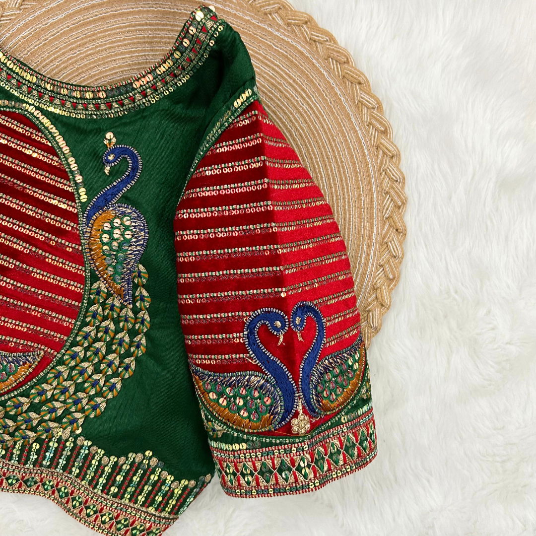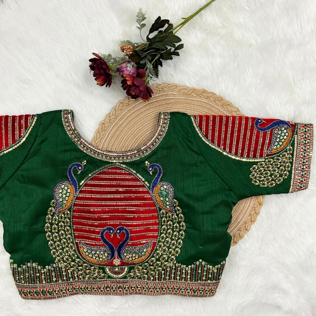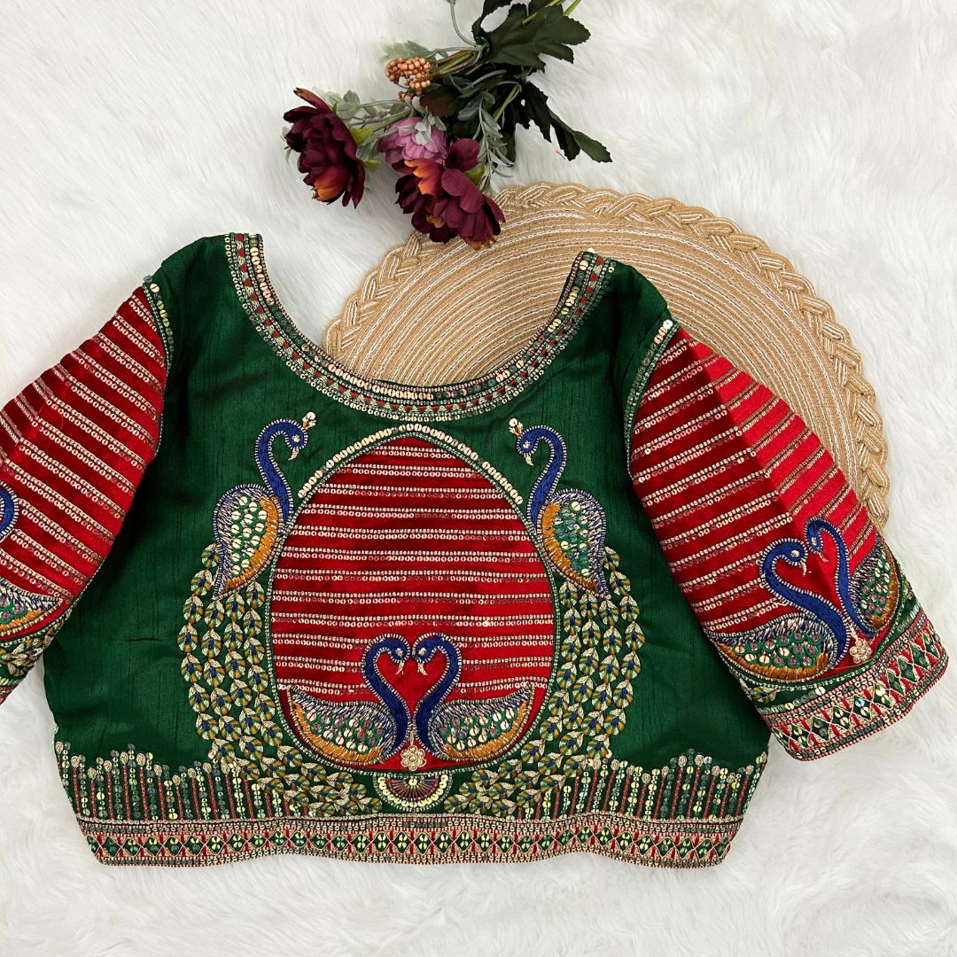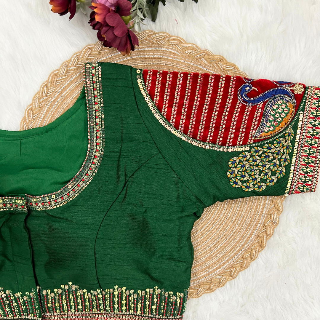 Introducing our exquisite "Heavy Bridal Wedding Blouse" crafted for the discerning bride seeking unparalleled elegance. This masterpiece features intricate Heavy Embroidery Work on a base of Heavy Pure Soft Timo, enhanced with Tricot Fuising for added finesse. The Plus Size variant, ready up to 42 inches and alterable up to 44 inches, ensures a perfect fit for every beautiful bride. The captivating design boasts a Beautiful Work bridal pattern, Heavy Stitching, and Heavy Padded Handmade Hooks adorned with Lovely Latkans, all complemented by a Front open Style. The Sleeves Less design adds a modern touch, making it an ideal choice for the contemporary bride. Elevate your wedding ensemble with this timeless creation.