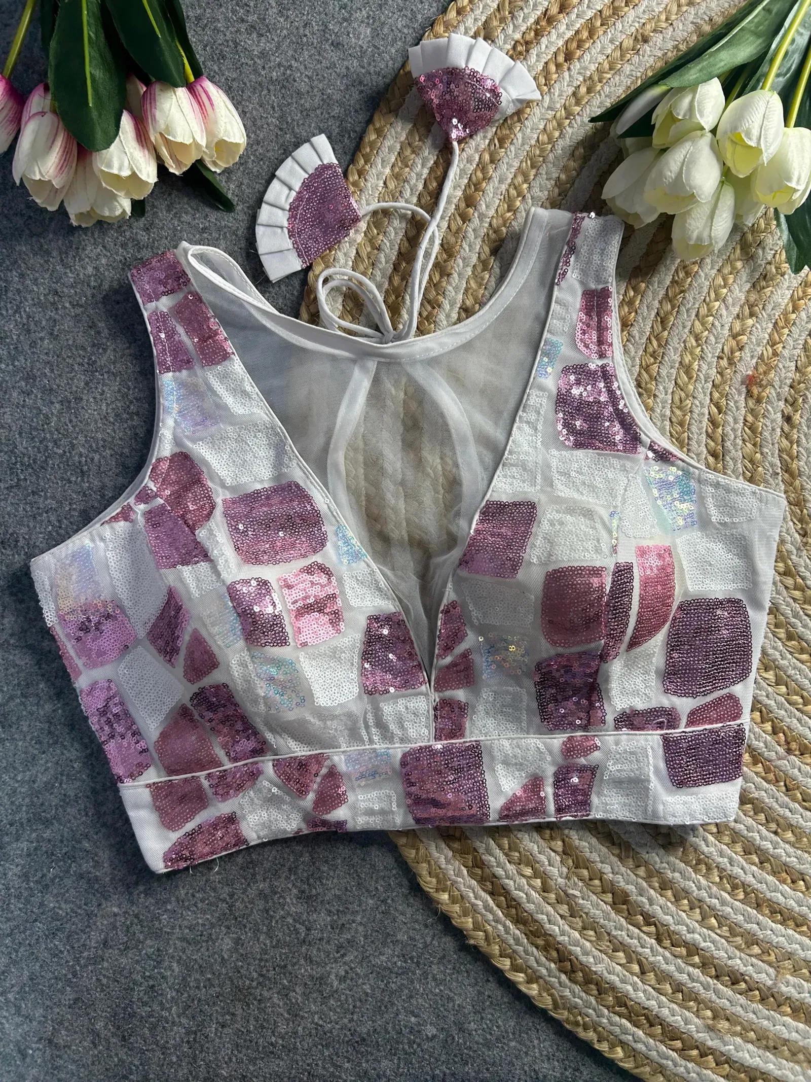 Shimmer with elegance at your next event in this deep-neck partywear blouse, adorned with dazzling rainbow sequence work on heavy imported net fabric. Featuring a sleek back-open design, heavy padding, and fine stitching, it’s perfect for making a statement. Ready at size 38 and alterable up to 40 inches.