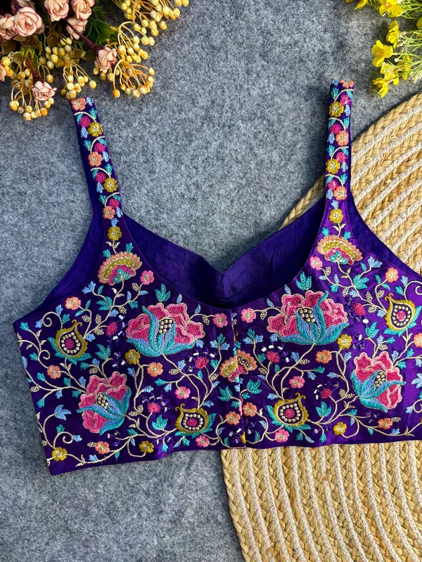 This stunning blouse is crafted from premium Pure Gajji Silk and adorned with intricate embroidery and real handmade mirror work. Featuring a back open style with cotton lining and soft padding, it offers a comfortable yet festive fit. Sleeveless and stretchable up to size 42, it’s perfect for special occasions.