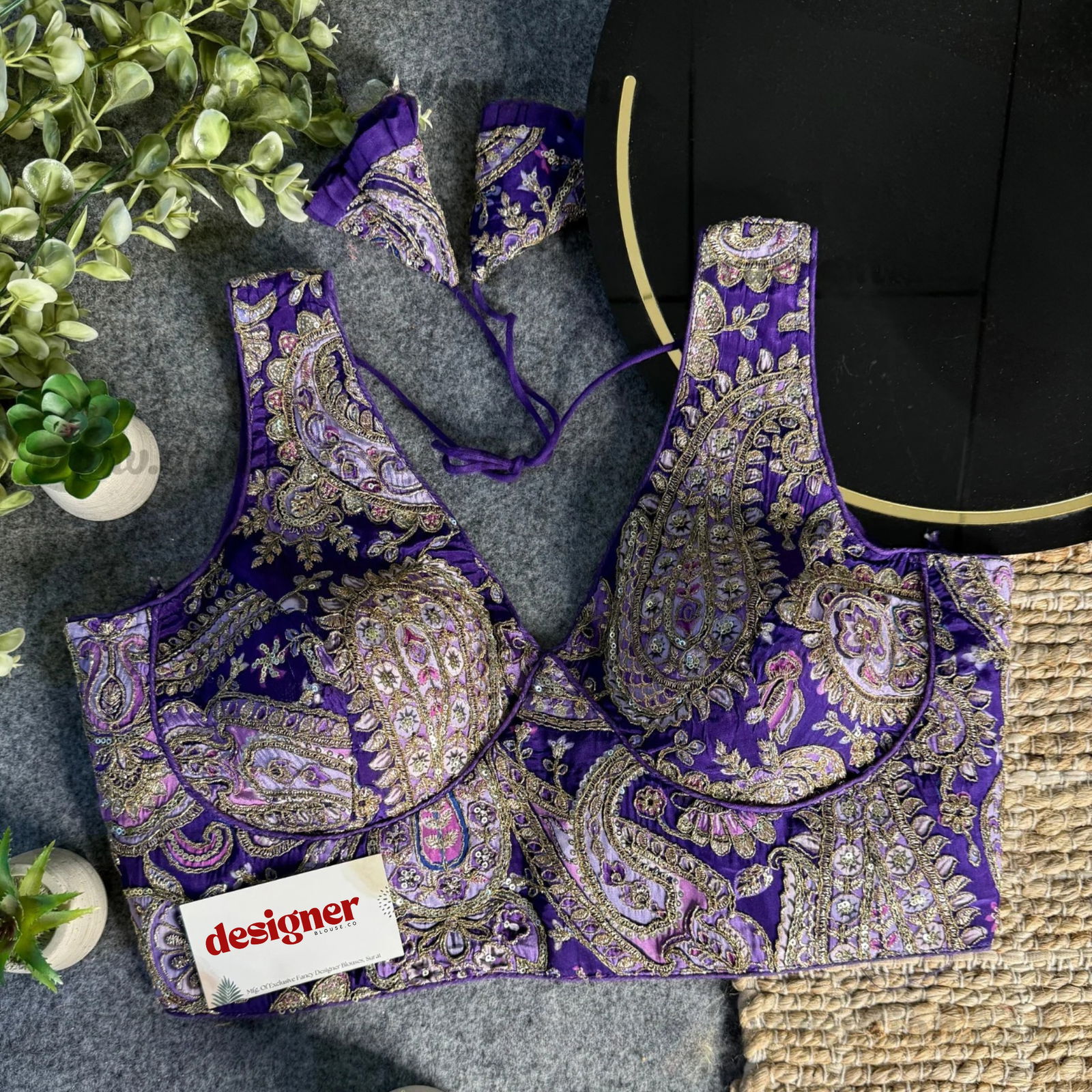 Embroidery Work V Neck Designer Blouse in premium heavy Chinnon fabric with exquisite position embroidery and stylish halter neckline. Comfortably padded with pure cotton lining, back open with hooks and attached inner sleeves. Free size, alterable up 34 to 42, perfect for all grand festive saree and lehenga looks