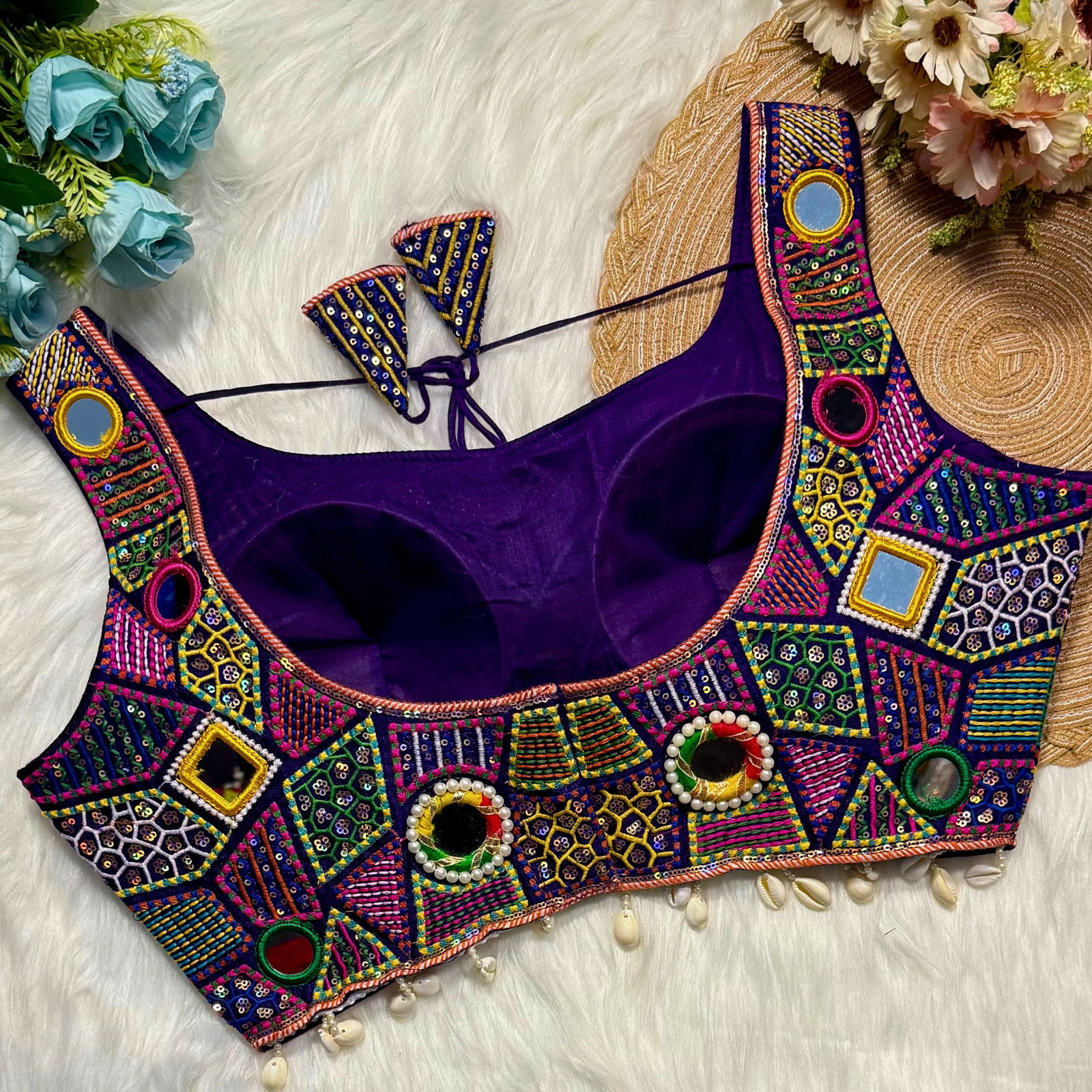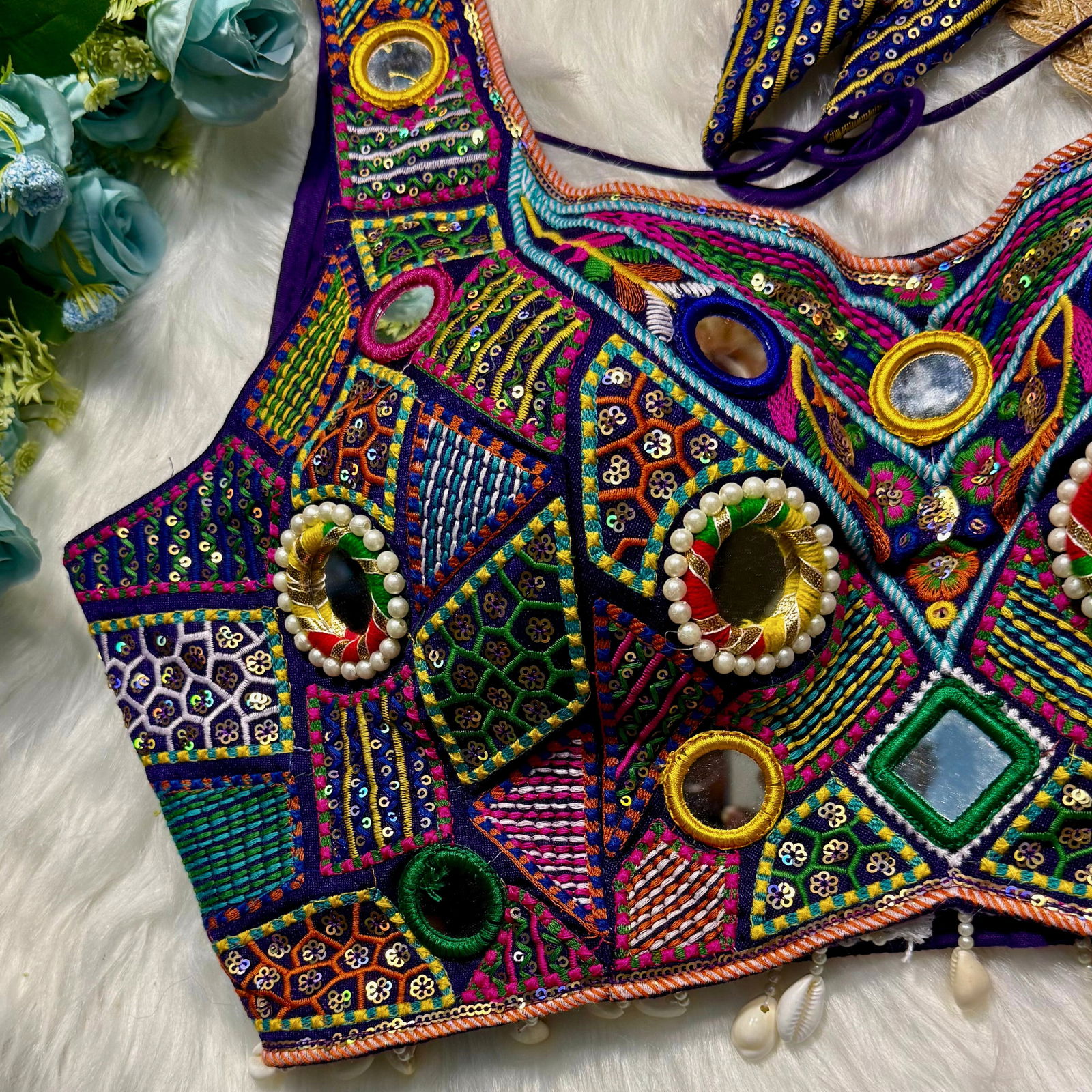 Get ready for Navratri, Garba, and Dandiya nights with this stylish readymade blouse. Made from rich Heavy Italian Silk, it features a fancy Gamthi and Shell Lace design. The blouse is padded, stitched beautifully, and perfect for festive nights. A must-have readymade blouse for your ethnic celebration look.