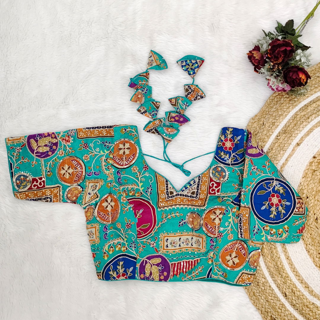 Elegant Chinon fabric blouse with digital print, perfect for Navratri. Lightweight, vibrant, and comfortable, ideal for festive celebrations. Stylish and unique for a standout look.