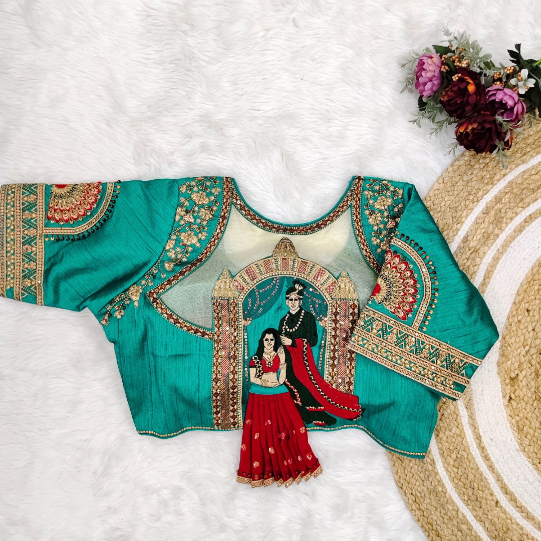 This fancy bridal blouse features heavy embroidery and stunning 3D Barbie work. Designed for partywear, it has heavy stitching, padded support, and a beautiful front-open style