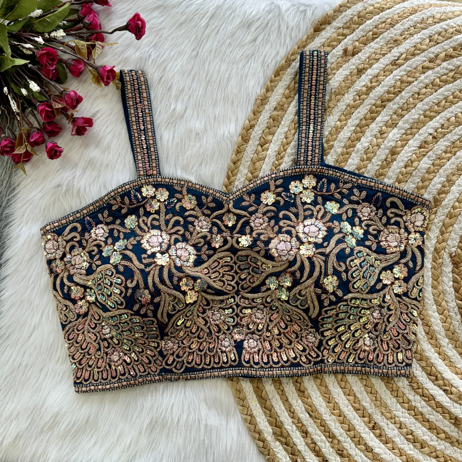 Elevate your party look with this spaghetti strap partywear blouse. Crafted from heavy fox georgette, this stylish and hot-selling blouse features a back open design, perfect for modern fashion lovers. A sleeveless designer blouse that's ideal for festive and wedding occasions. Alterable to fit sizes 34 to 42 inches.