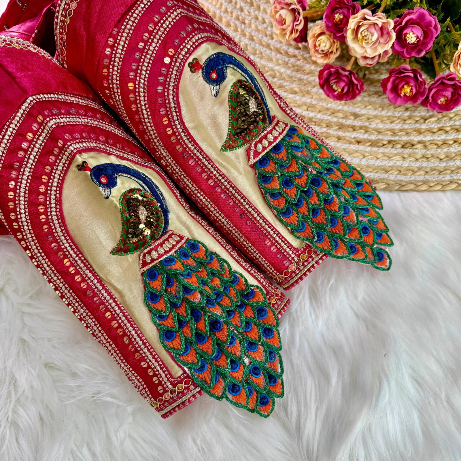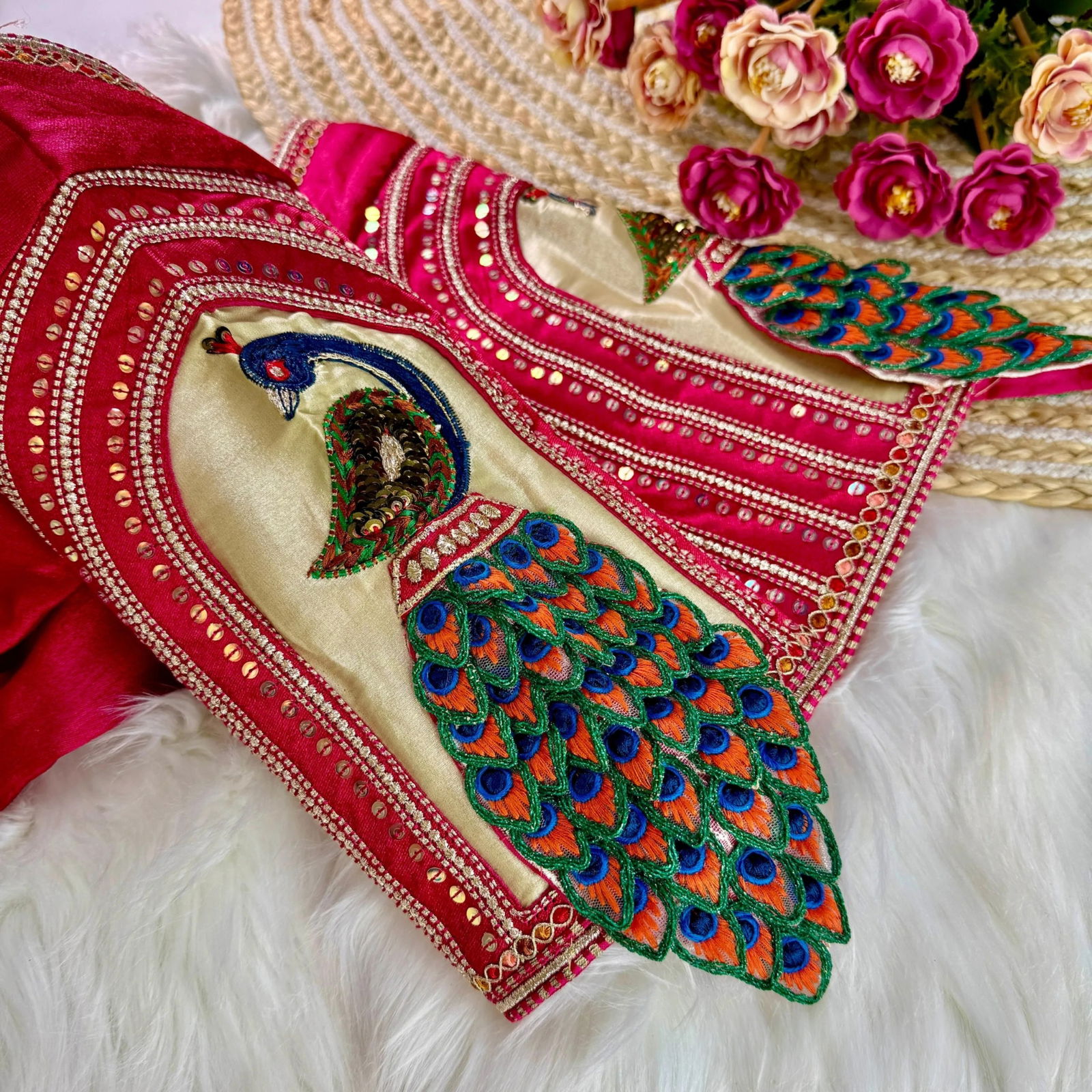Make a grand bridal statement with this elegant 3D Peacock design blouse. Crafted in heavy Italian silk, it features intricate embroidery, soft padding, and striking long sleeves. The front-open style with handmade hooks adds traditional charm. Ready in size 40 and alterable up to 42 for a perfect festive fit.