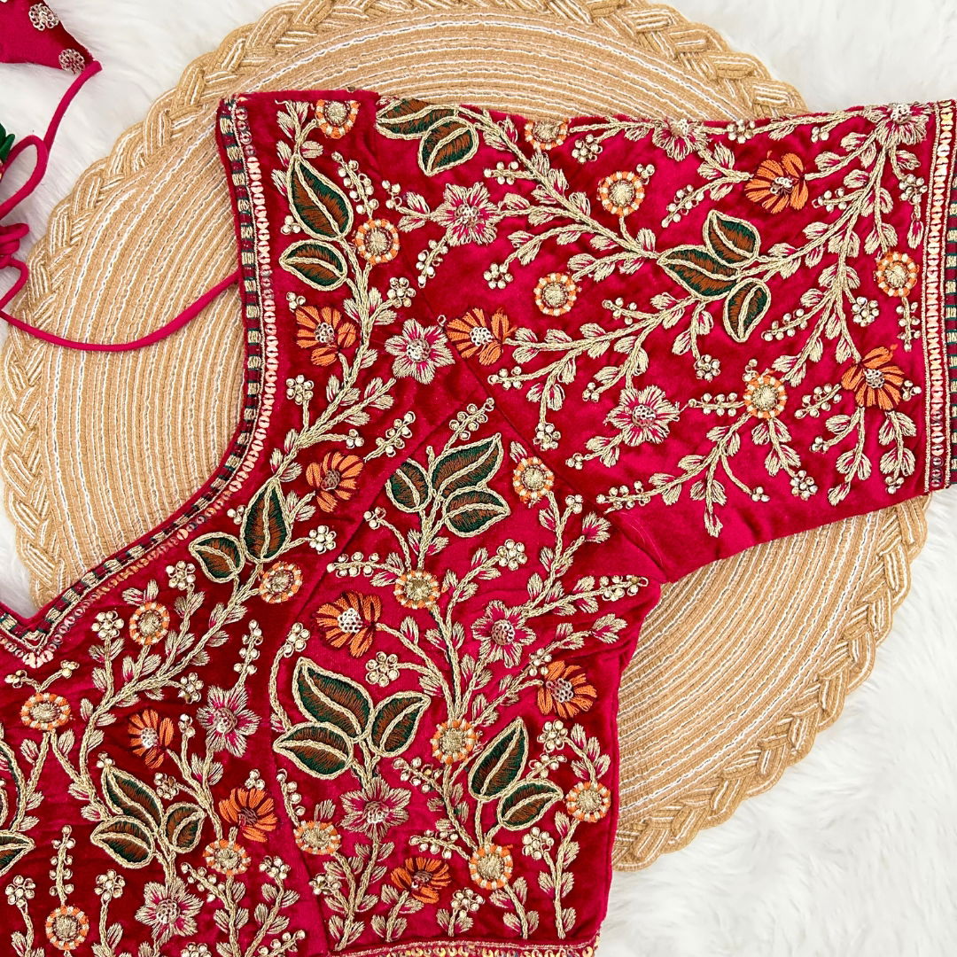 Make a grand statement in this luxurious bridal blouse made with heavy pure soft velvet and intricate real diamond handwork. The designer piece features detailed embroidery, padded stitching, and handcrafted latkans. Perfect for weddings or festive occasions, this partywear blouse ensures comfort with cotton lining and an easy back hook closure.