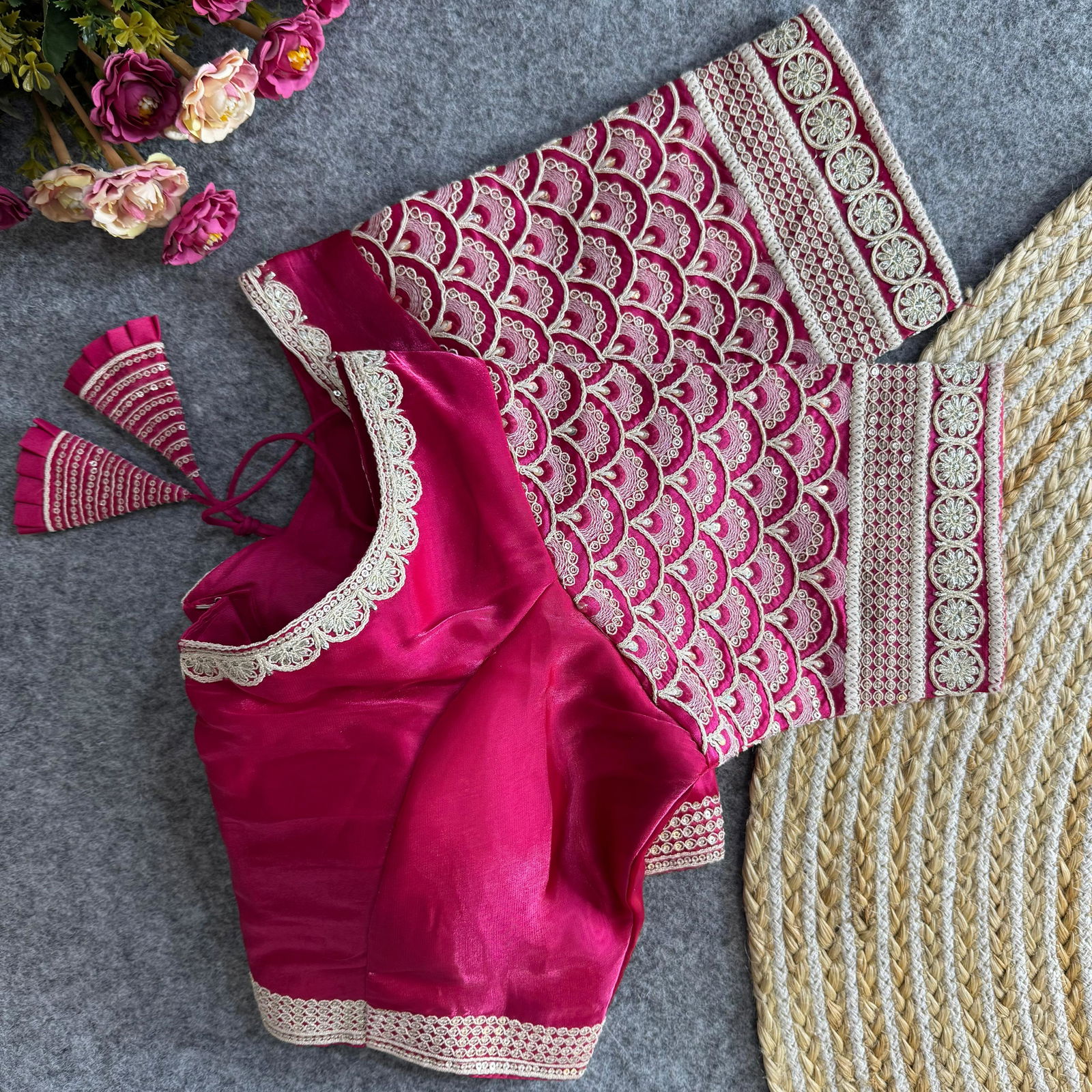 Elevate your bridal look with this exquisite blouse made from heavy soft silky Zimichoo fabric. Featuring intricate cotton thread codding embroidery and 2MM sequence work, it exudes sophistication. Designed with heavy padding, detailed stitching, and handmade hooks with latkans, this front-open blouse is ready in size 40 and alterable up to 42 inches, available in 10 vibrant colors.