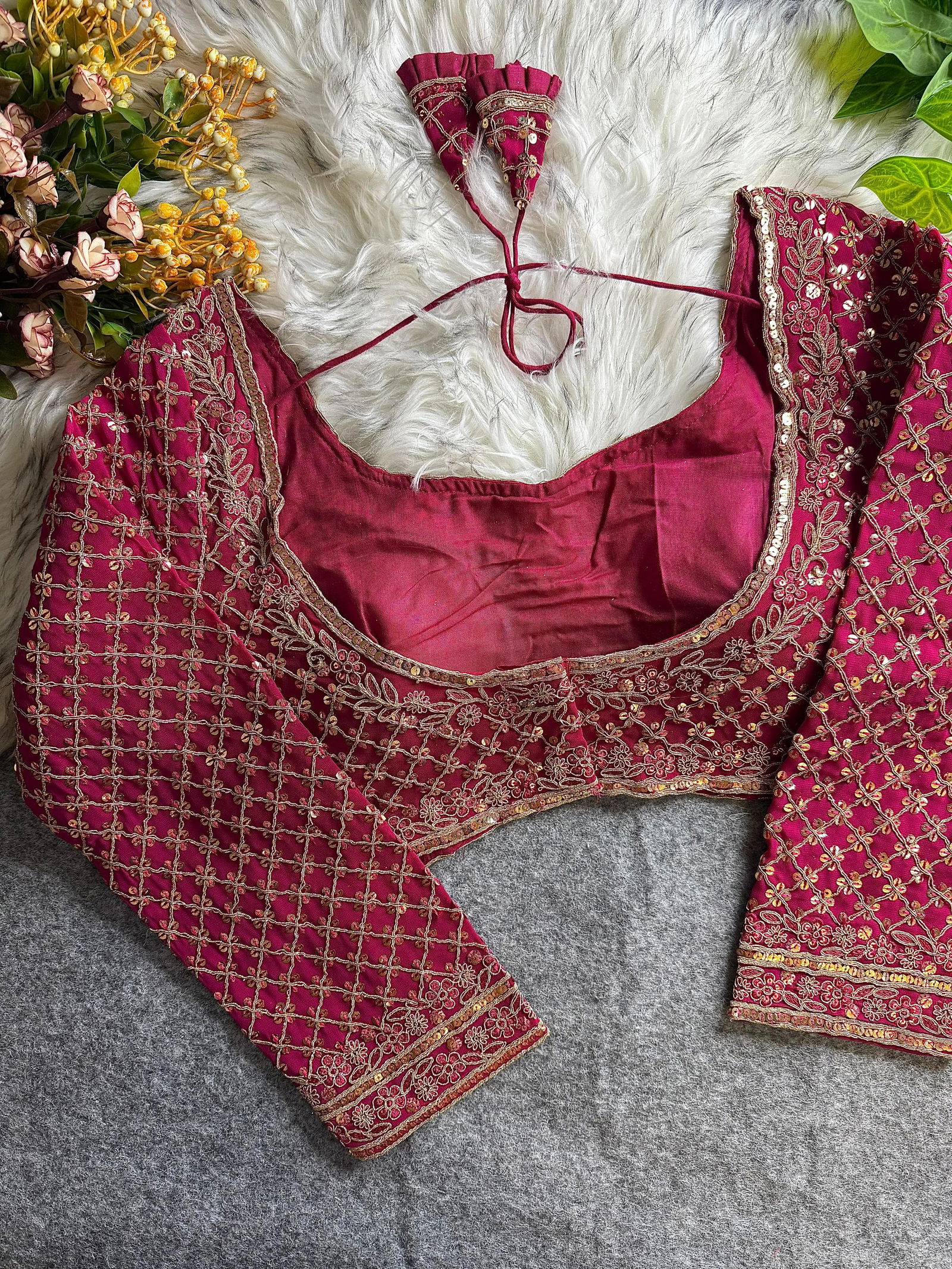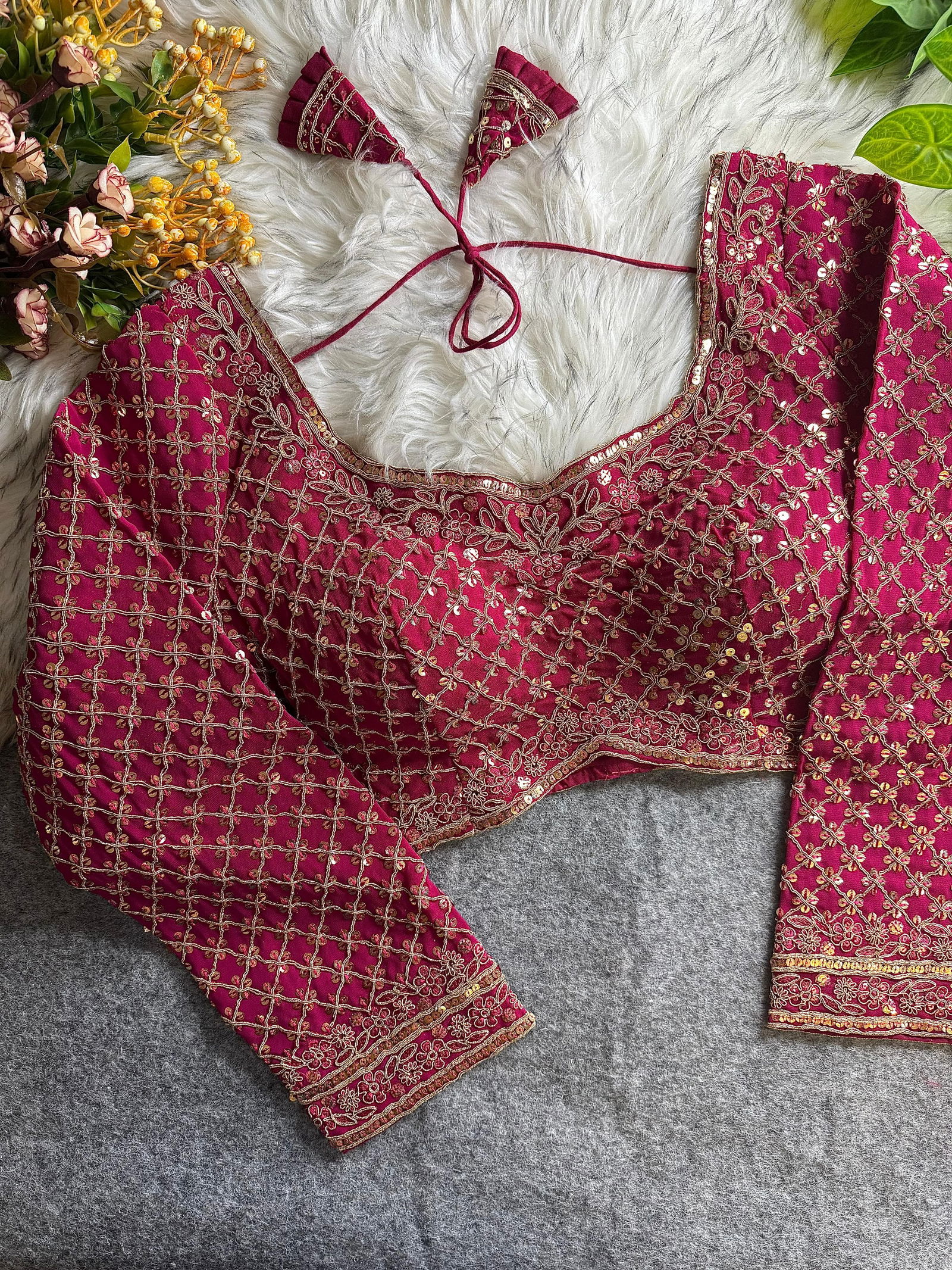 Elevate your ethnic style with this stunning Heavy Fox Georgette blouse featuring full-body codding sequence work. Designed for comfort and glamour, it includes pure cotton lining, soft padding, and 20+ inch long sleeves. This back-open blouse with hooks fits up to size 42 and is perfect for weddings and parties.