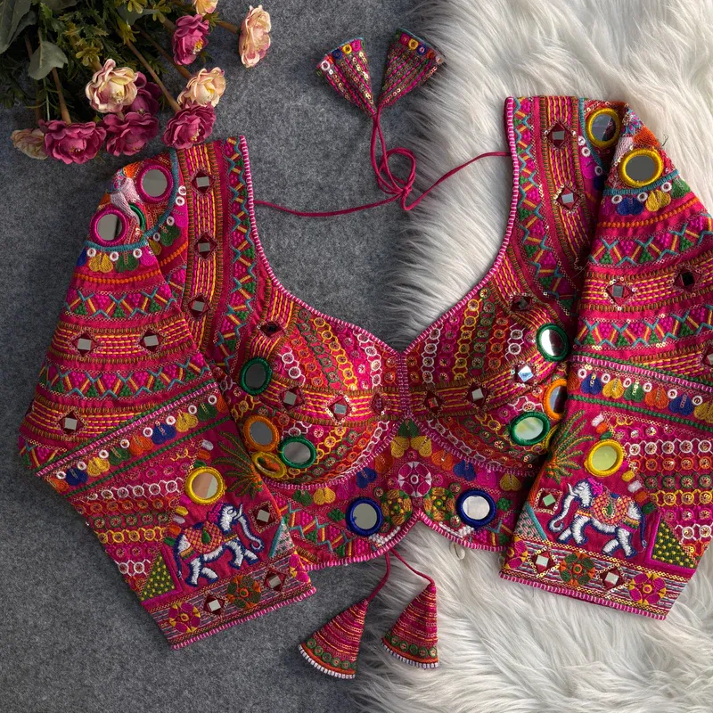 Make a dazzling statement this Navratri with our Rani multicolor full sleeves mirror work blouse. Designed for Garba nights, this blouse features heavy embroidery, hand mirror detailing, and rich sequence on premium Italian silk. Perfect for traditional flair, it adds elegance and sparkle to your Navratri outfit with its stylish back-open fit.
