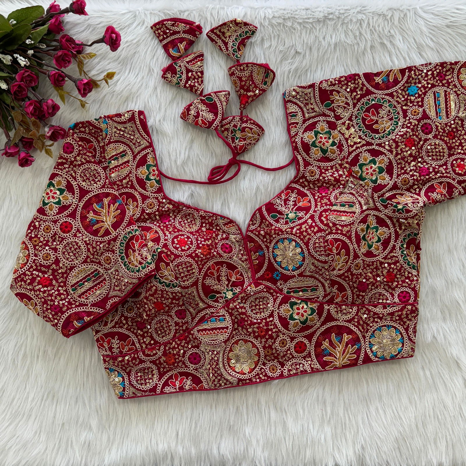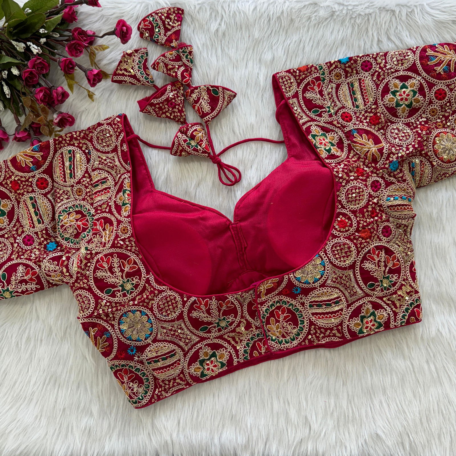 Elevate your party look with our intricately stitched, heavily padded blouse. Handmade hooks, back-open style, and beautiful latkans add allure. A perfect blend of elegance and sophistication for any occasion.