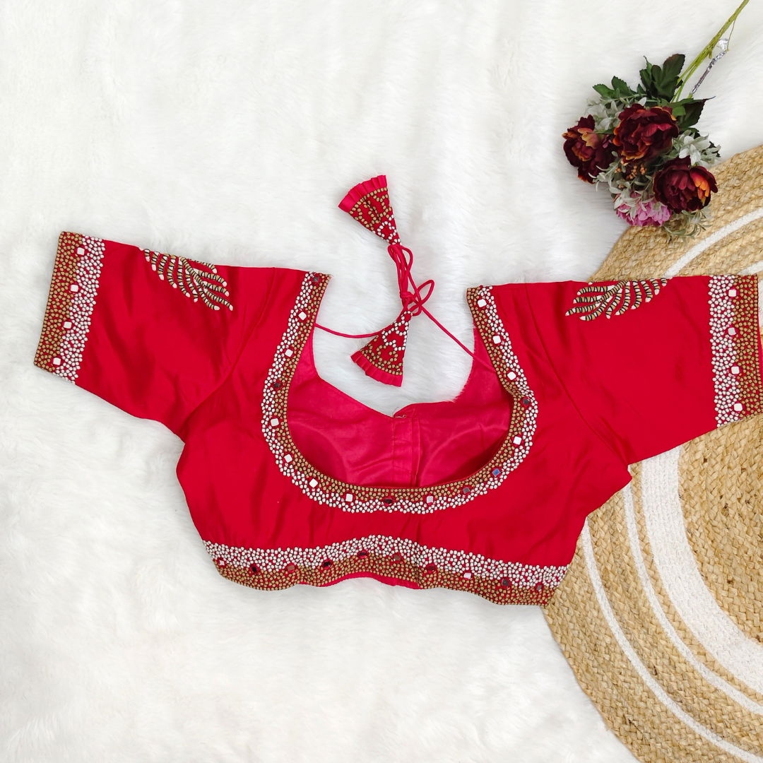 Pure Timo Silk handmade designer blouse with heavy thread embroidery and intricate handwork. Features real mirror embellishments. Elegant, unique, and perfect for special occasions.