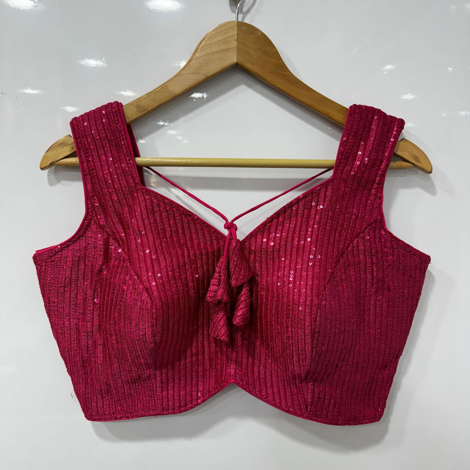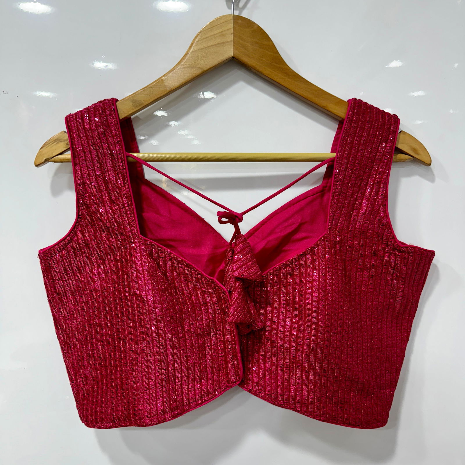 Gorgeous party-ready blouse with shimmering sequins, intricate stitching, heavy padding, and an elegant open-back design.