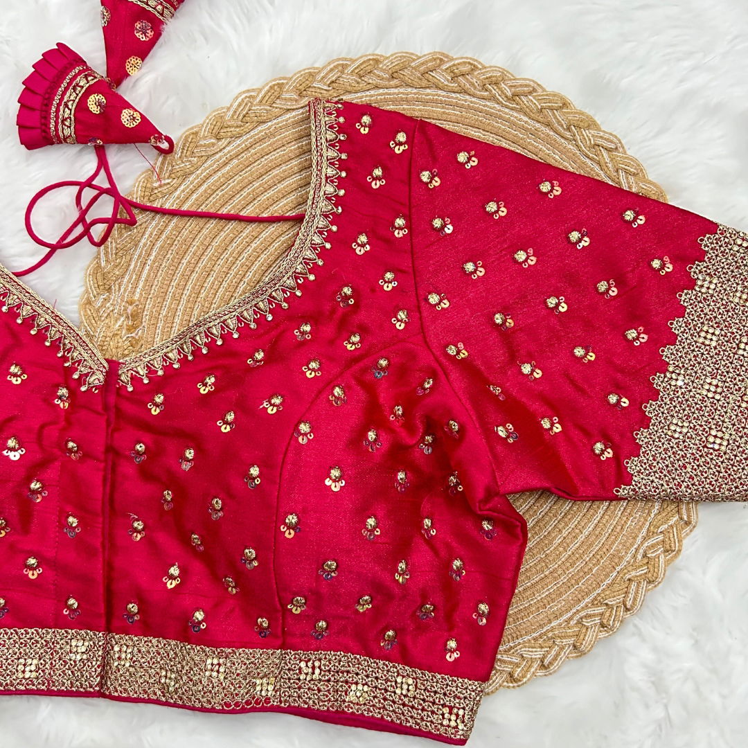 Exquisite Milan silk blouse, adorned with intricate thread sequence work, padded handmade hooks, and elegant front open design with charming latkan