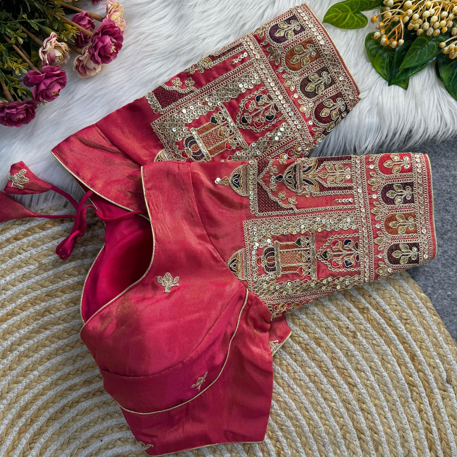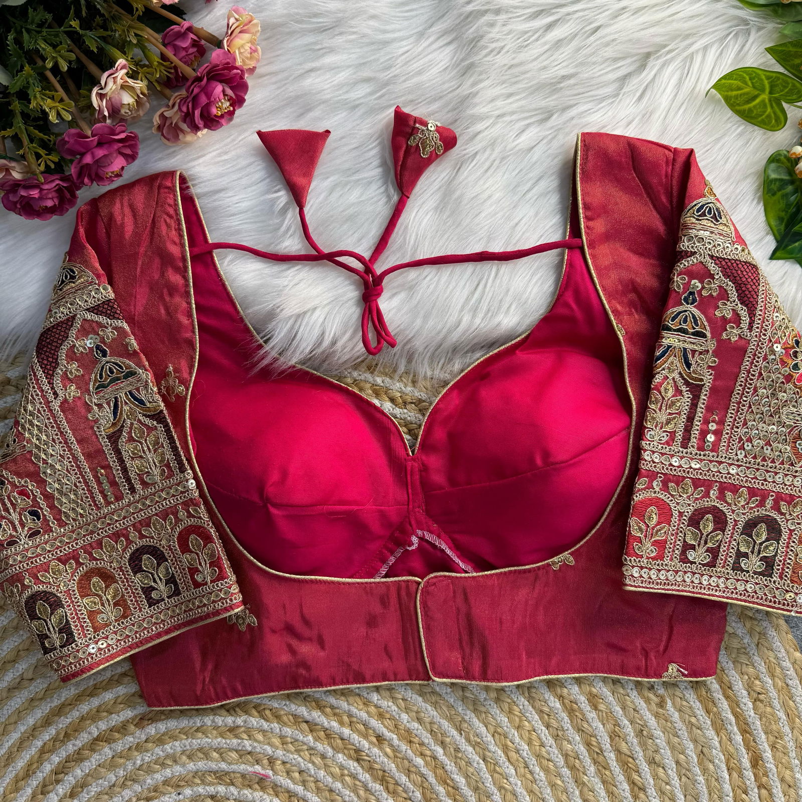 Designed for a flattering fit, this blouse features a round neckline and half sleeves, ensuring both comfort and style. The fine detailing and premium craftsmanship make it an ideal match for silk sarees, lehengas, or even fusion wear. Pair it with statement jewelry and a designer drape to create a mesmerizing traditional look.