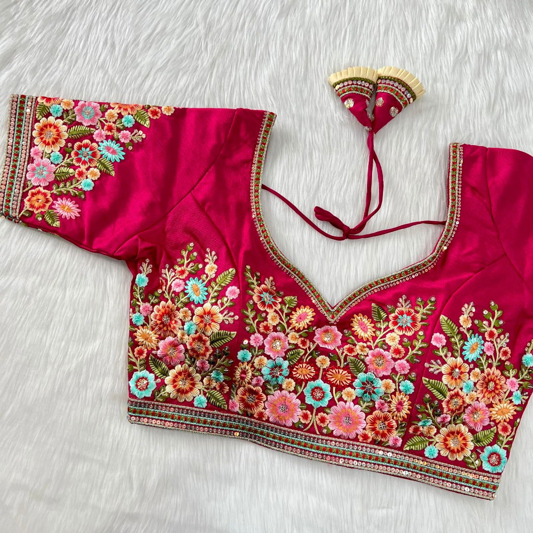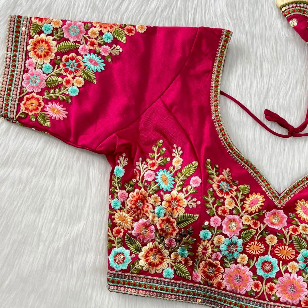 Celebrate Navratri in style with our "Navratri Special Nidal Multi Work Blouse." Crafted from Heavy Timo Silk, it boasts intricate Heavy 11 Nidal Wishkosh Multi Thread work complemented by vibrant Rainbow Sequences, ensuring a festive look that captivates.