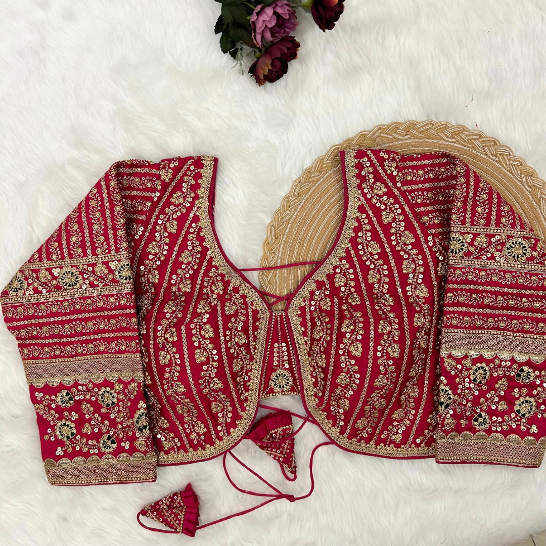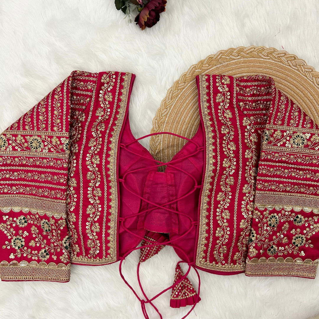 Make a statement in this beautiful bridal look blouse featuring a backless design with stylish dori. Crafted from rich Timo Silk, it comes with extra-long18-inch sleeves and soft padding for comfort. Perfect for weddings or special occasions, this designer blouse is ready in size 40 and alterable up to 44.