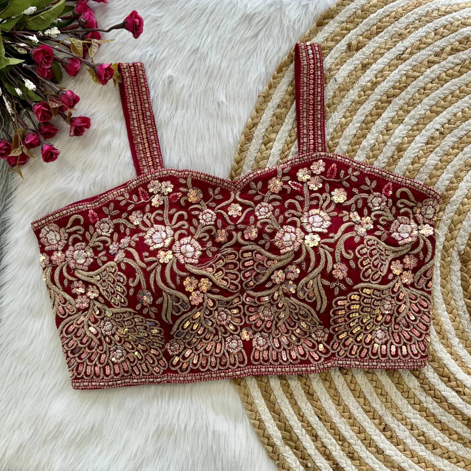 Indulge in opulence with this stunning blouse, featuring heavy embroidery and beautiful handwork. Crafted from heavy fox georgette, it exudes elegance and grace. The blouse comes in a size 38” ready to be altered up to 42 inches, offering a perfect fit. With its back open style and spaghetti straps, it's perfect for a party or special occasion.
