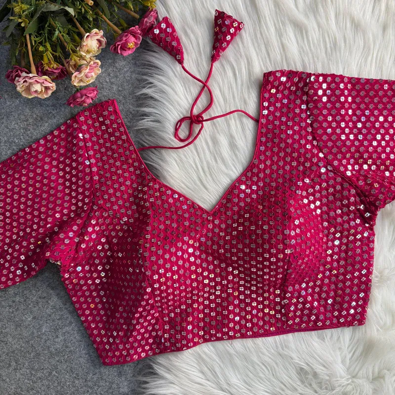 Dazzle this Navratri in our red Sabyasachi style blouse, crafted from premium fox georgette with intricate sequence work. This festive-ready blouse is perfect for Garba and Dandiya nights, featuring a designer neck pattern, padded comfort, and traditional charm. The rich red hue makes it a standout readymade blouse for Navratri.