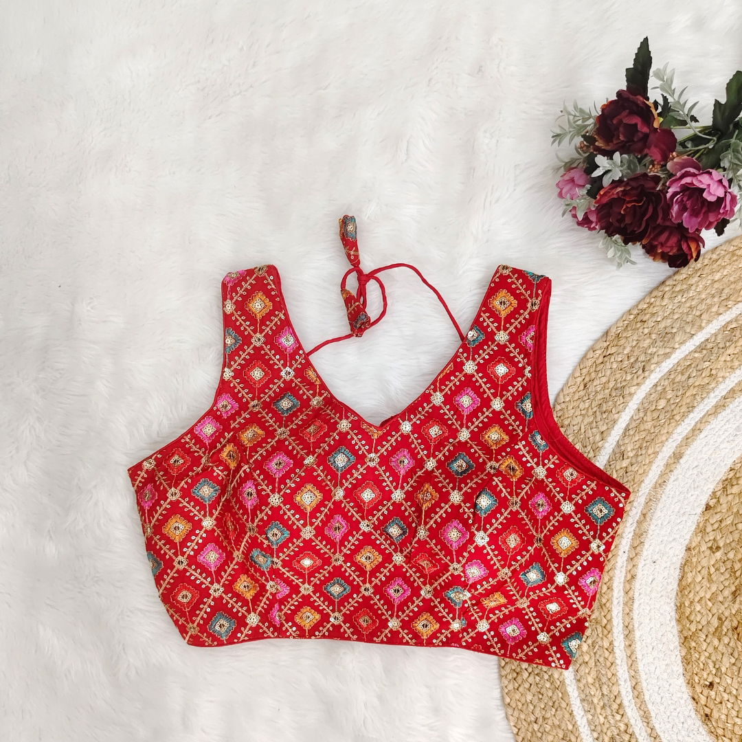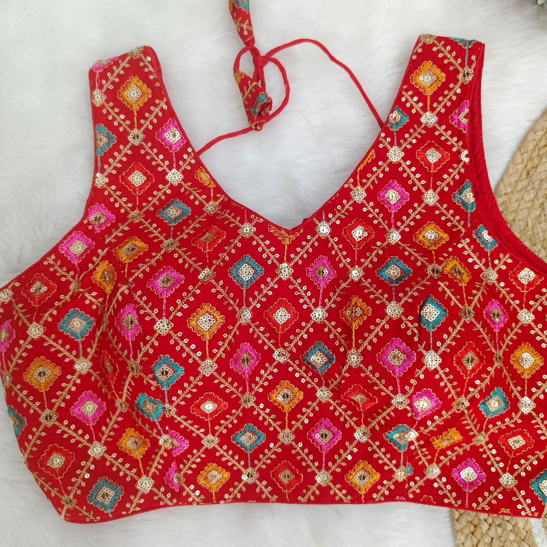Georgette fabric blouse with multi-color embroidery, perfect for Navratri. Lightweight, vibrant, and stylish, ideal for festive celebrations. Enhance your look with this unique design.
