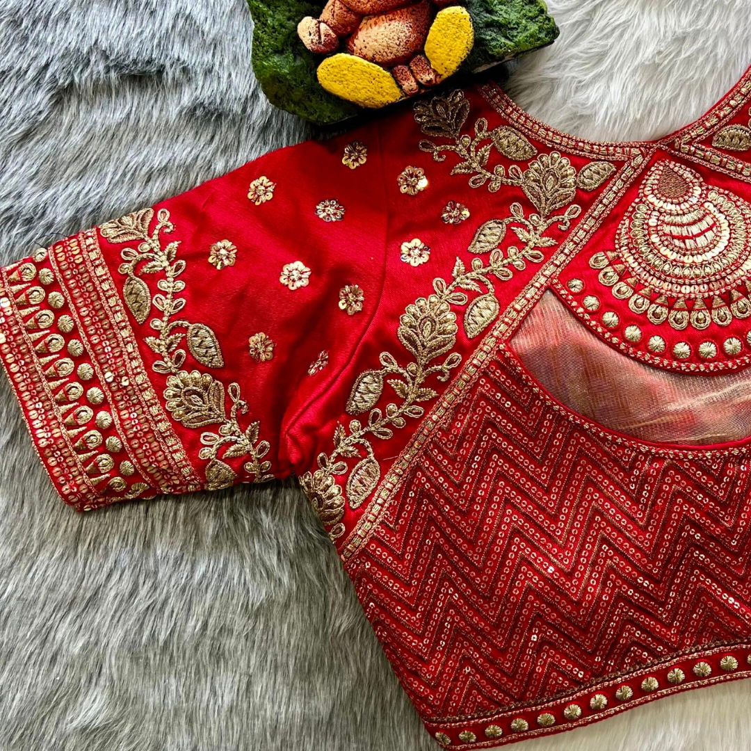 Introducing our exquisite "Heavy Wedding Blouse" crafted for the discerning bride seeking timeless elegance. This opulent blouse features intricate GOLD Jari with Rainbow 4 Sequence Heavy Embroidery Work, creating a dazzling masterpiece. The luxurious fabric, Heavy TIMO Silk, ensures a regal feel. Available in Plus Size 40” (alterable up to 42 inches), this blouse boasts a Beautiful Gold Work bridal design, meticulously stitched with Heavy Padded Handmade Hooks and adorned with Beautiful Latkans. The Front open Style adds a touch of modern sophistication. Elevate your bridal ensemble with this statement piece, a perfect blend of tradition and contemporary style.