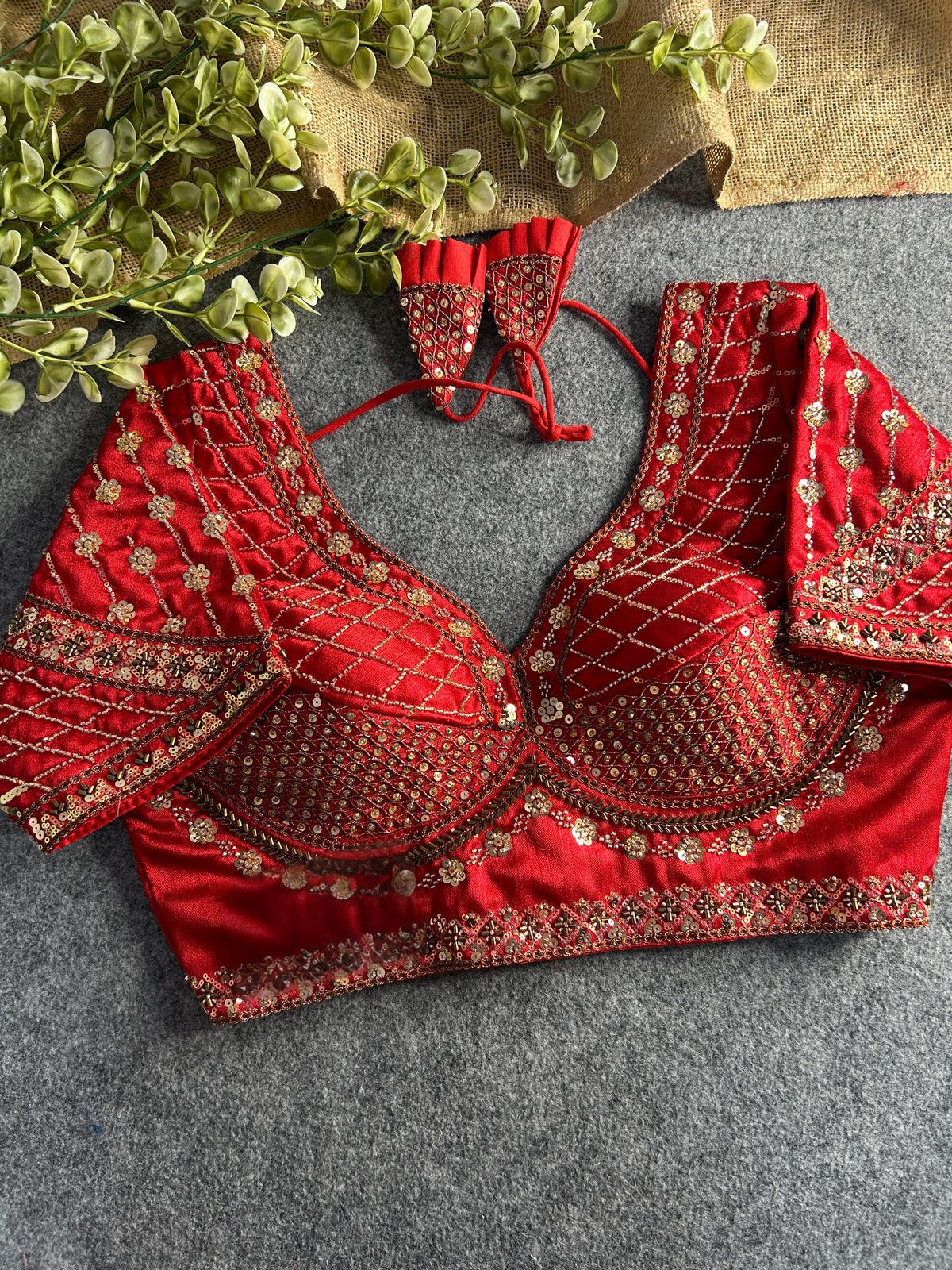 Elevate your bridal look with this exquisite Sabyasachi-inspired blouse, meticulously crafted with heavy handwork, sequins, and cording thread embroidery. Featuring intricate beadwork and a stunning array of stars, this blouse is designed for the modern bride who seeks elegance with a touch of opulence.
