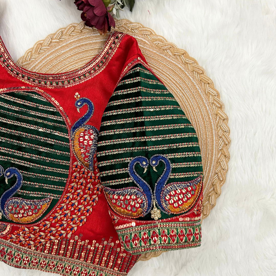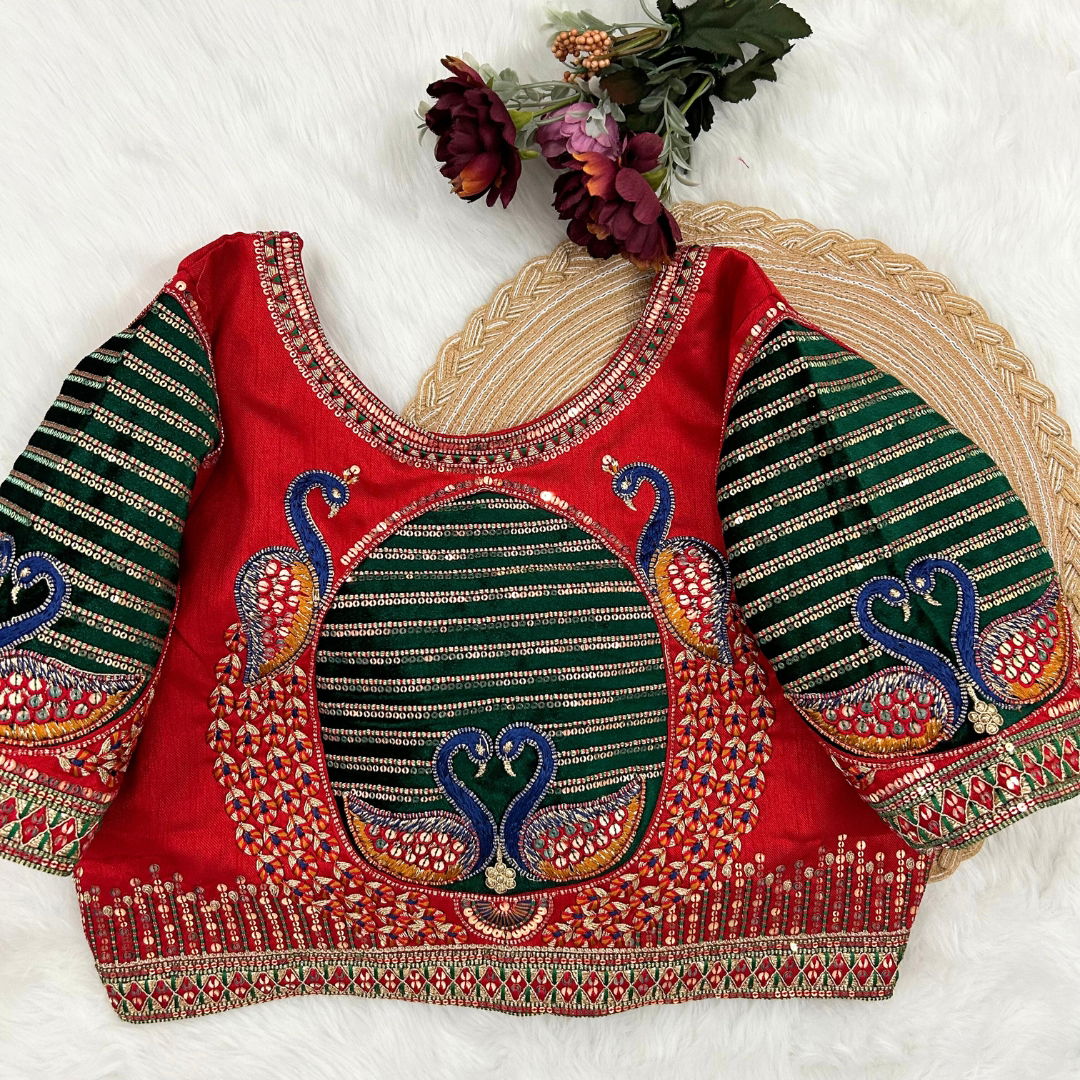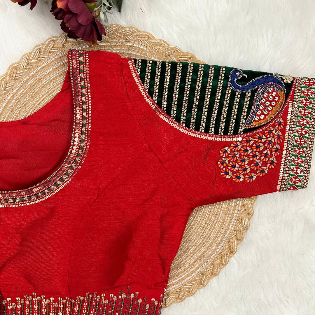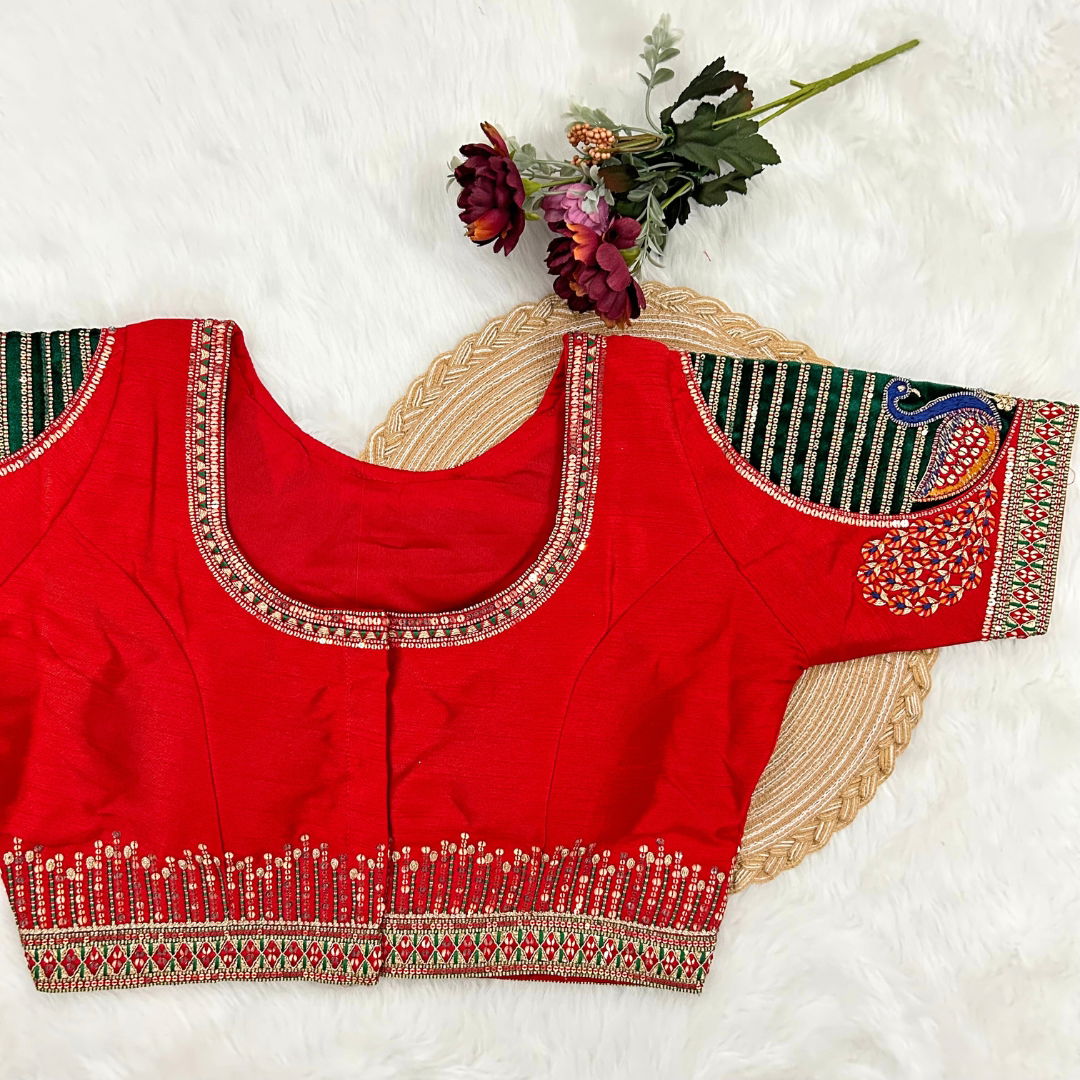 Introducing our exquisite "Heavy Bridal Wedding Blouse" crafted for the discerning bride seeking unparalleled elegance. This masterpiece features intricate Heavy Embroidery Work on a base of Heavy Pure Soft Timo, enhanced with Tricot Fuising for added finesse. The Plus Size variant, ready up to 42 inches and alterable up to 44 inches, ensures a perfect fit for every beautiful bride. The captivating design boasts a Beautiful Work bridal pattern, Heavy Stitching, and Heavy Padded Handmade Hooks adorned with Lovely Latkans, all complemented by a Front open Style. The Sleeves Less design adds a modern touch, making it an ideal choice for the contemporary bride. Elevate your wedding ensemble with this timeless creation.