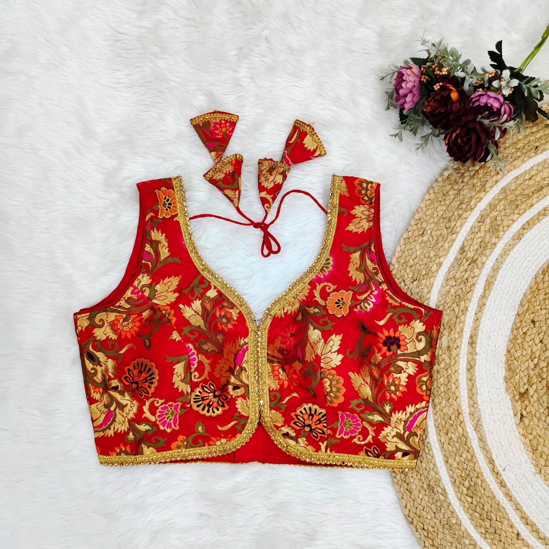 Elevate your Navratri style with our stunning Jacquard Fabric Blouse. Intricately crafted with heavy stitching and padding, featuring a beautiful apple cut design and back hooks open style, perfect for the festive Garba celebrations.