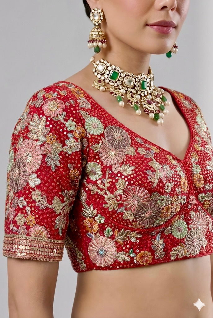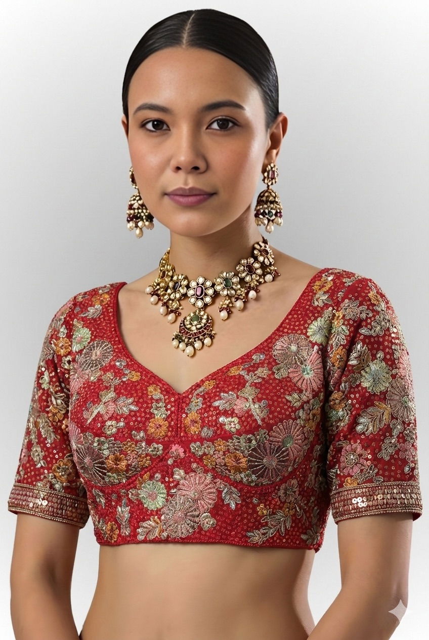 Step into elegance with this stunning wedding and partywear blouse made from heavy Fox Georgette. Featuring rich sequence and embroidery work, it comes with 9-inch long sleeves, heavy padding, and designer back-open styling. A perfect choice for festive and bridal occasions, offering comfort and flair in size 40, alterable up to 42.