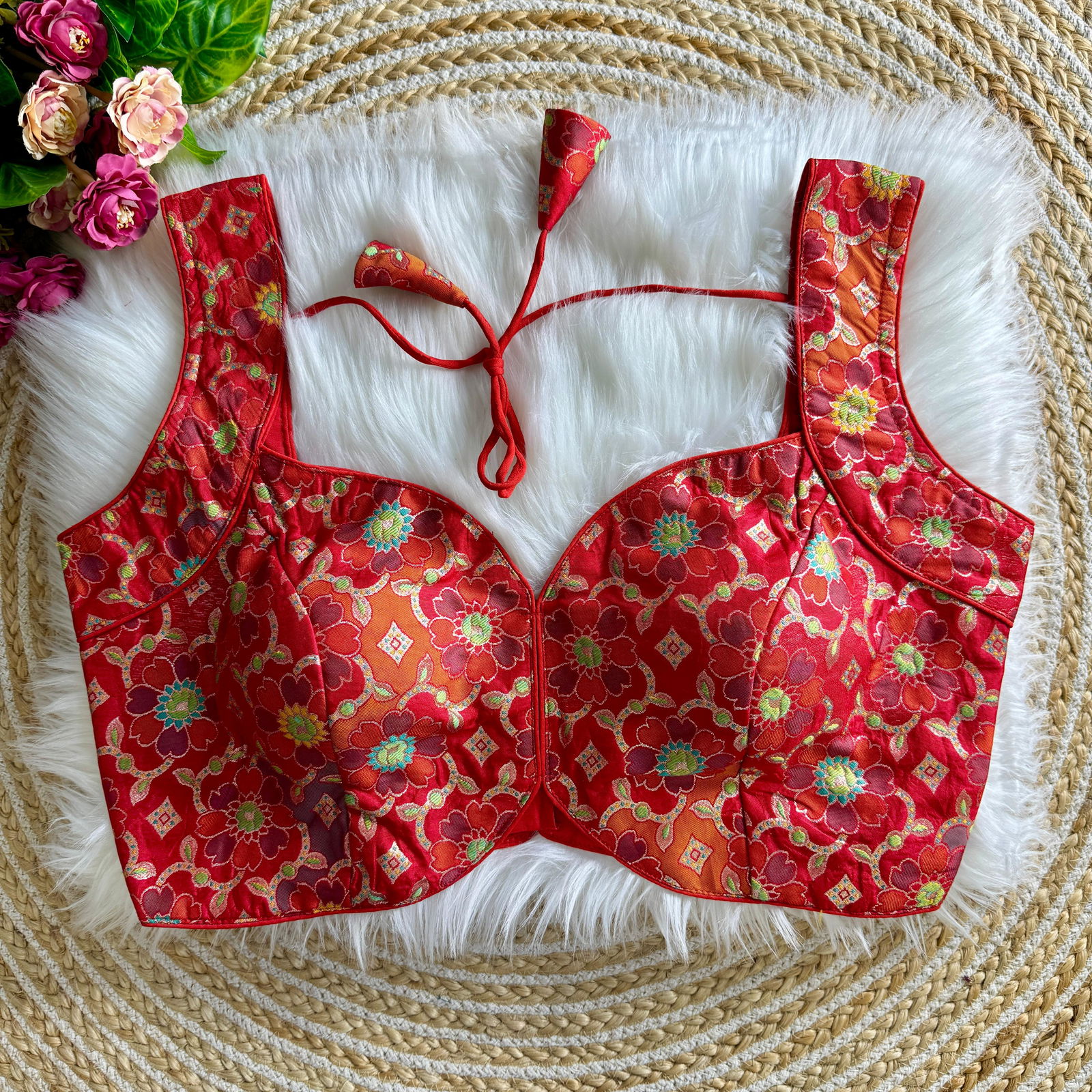 Make a bold statement with this sleeveless Rapier Jacquard blouse, perfect for partywear. Designed with a pure Indo cotton lining for comfort, it features heavy padding, intricate stitching, and a chic back-open style. Available in 12 vibrant colors, this blouse is ready at size 38 and alterable up to 40 inches.