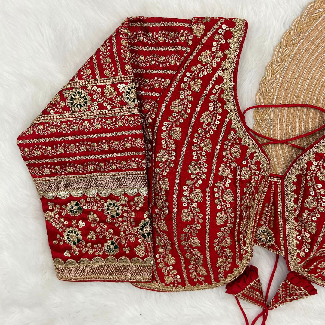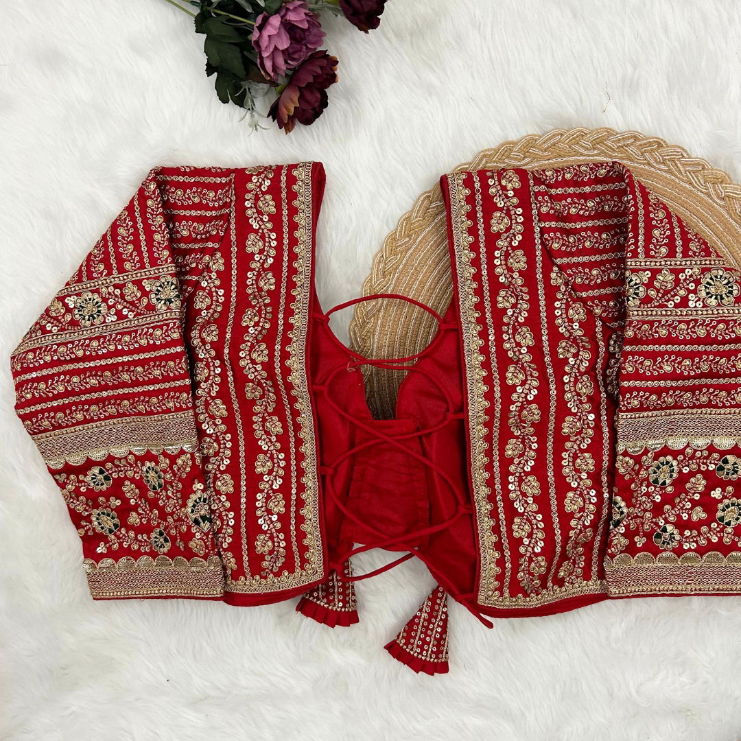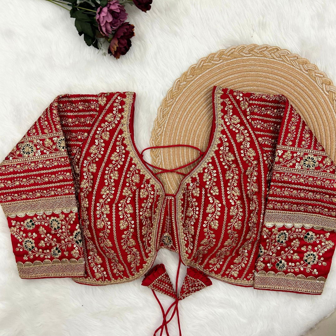 Make a statement in this beautiful bridal look blouse featuring a backless design with stylish dori. Crafted from rich Timo Silk, it comes with extra-long18-inch sleeves and soft padding for comfort. Perfect for weddings or special occasions, this designer blouse is ready in size 40 and alterable up to 44.