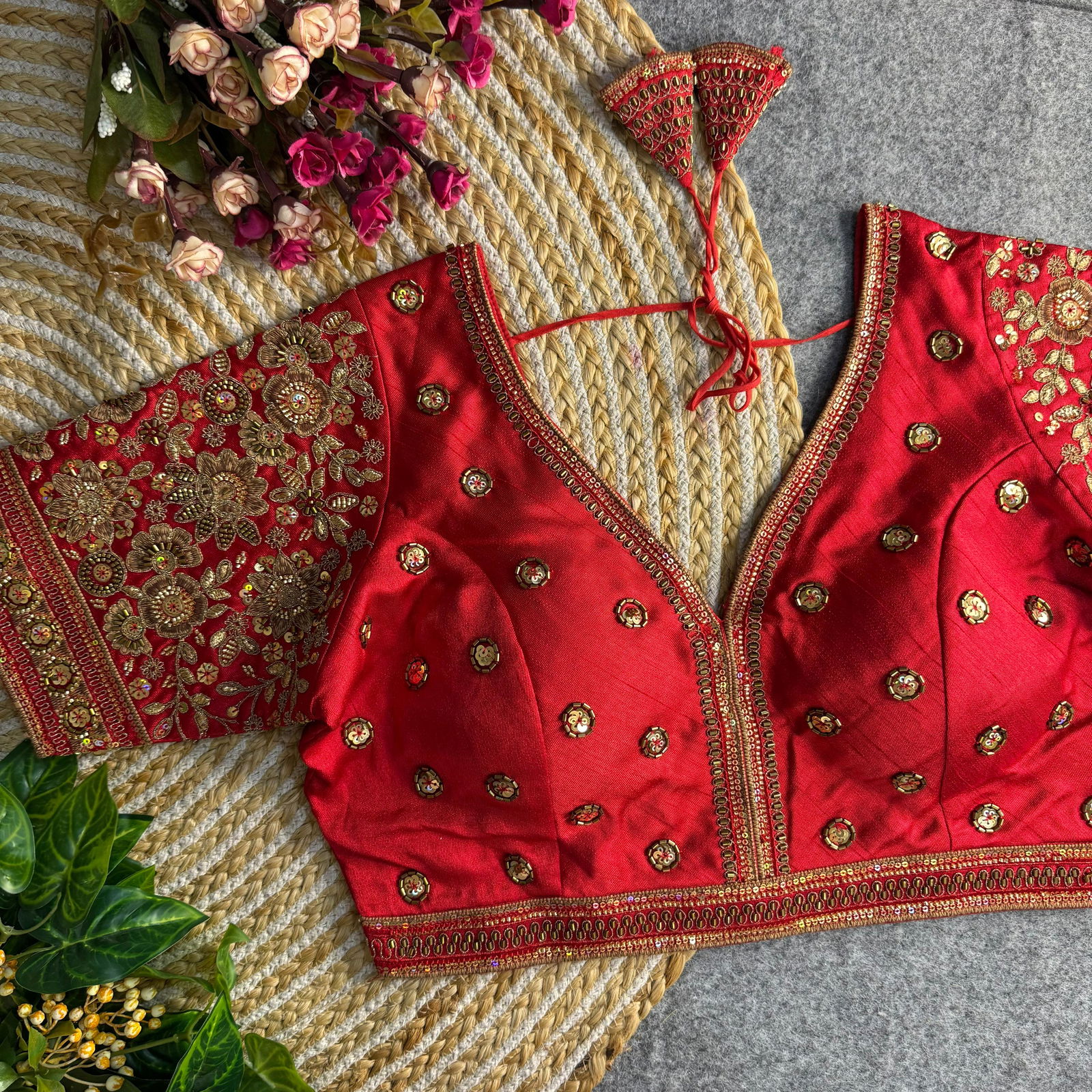 Elevate your bridal or party look with this Sabyasachi-style V-neck blouse. Made from heavy soft Italian silk, it features stunning copper matching beads, codding thread, and sequence work. With 12-inch sleeves, handmade hooks, and padded comfort, this designer blouse is perfect for weddings and grand occasions. Back open style adds elegance.